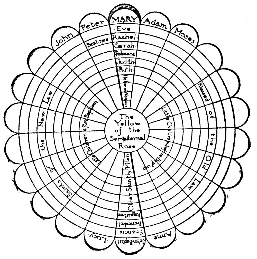 | Tenth Heaven, the Empyrean. | The Essential Paradise of Angels and Saints. (Throne of Henry VII.) Bernard. Blessed of the Mystic Rose. Gabriel. Blessed Virgin Mary. | Divine Science of Theology. | xxx.-xxxiii. | ||