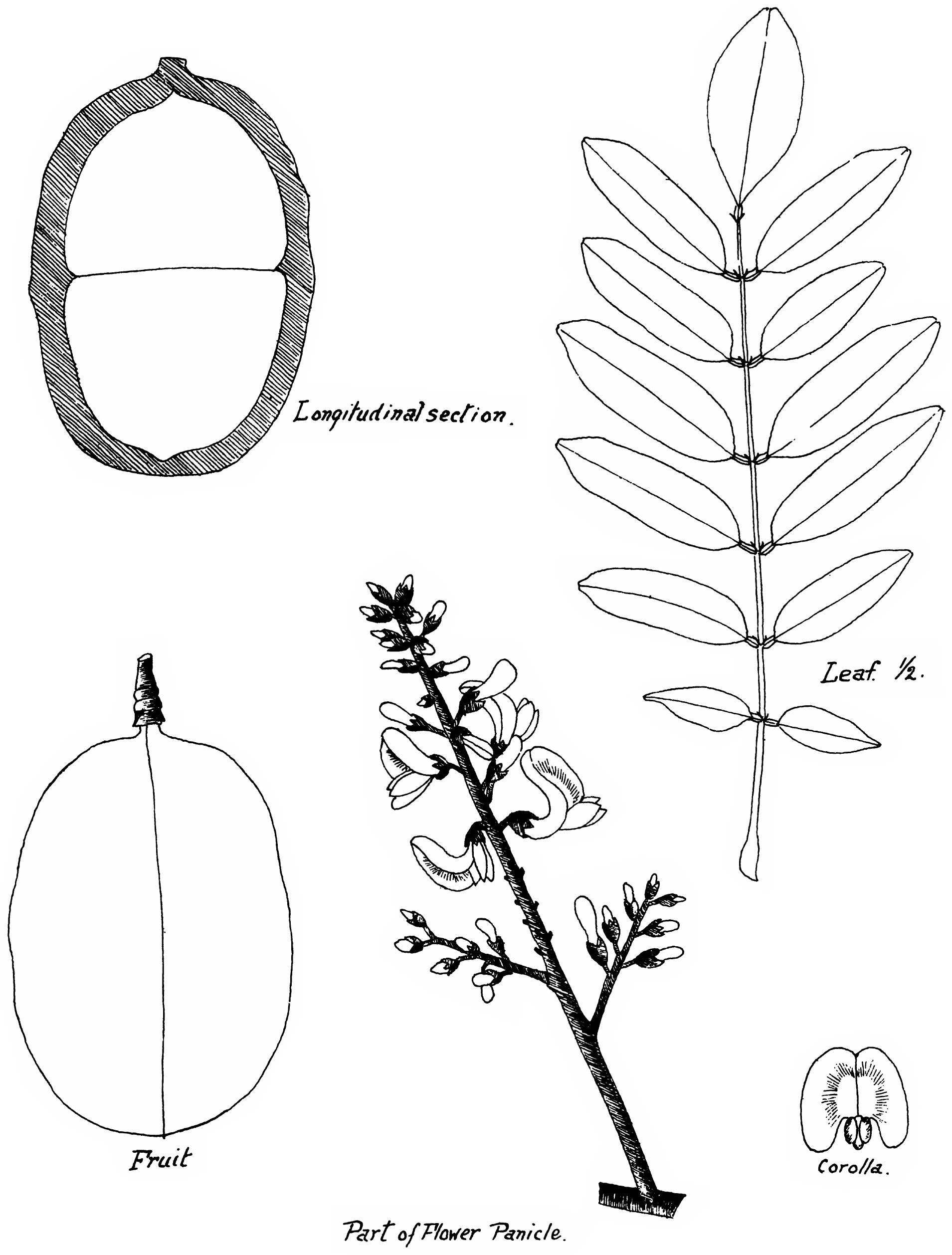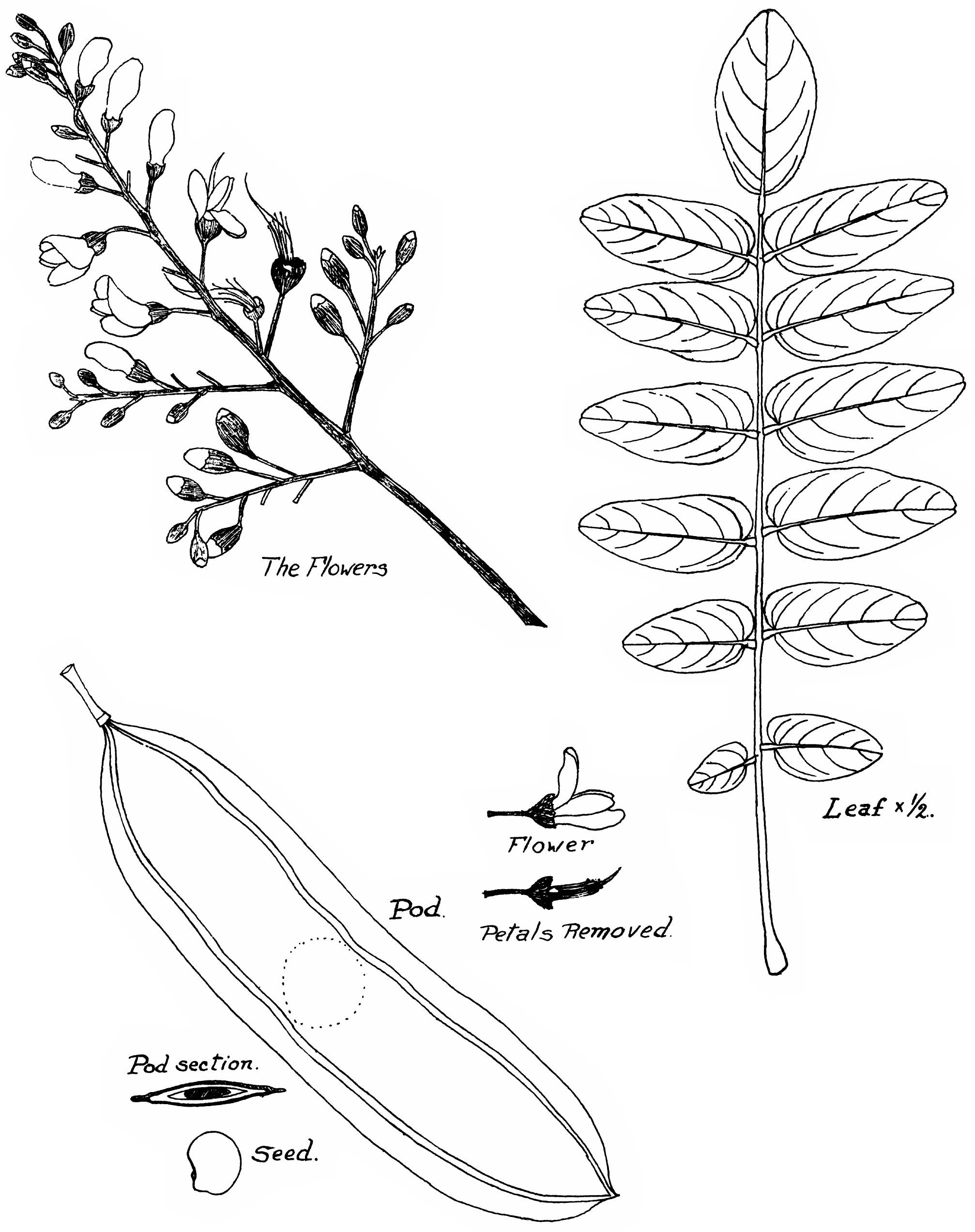 The Fruits are pods, 4-5 inches long, ¾ inch wide, very flat, with the seeds slightly embossed. They are very numerous, tenacious and conspicuous on the trees from October onwards. The seeds, about six in a pod, are round, flat, shiny and dark brown, the same colour as the pods, and have strong germinating power.