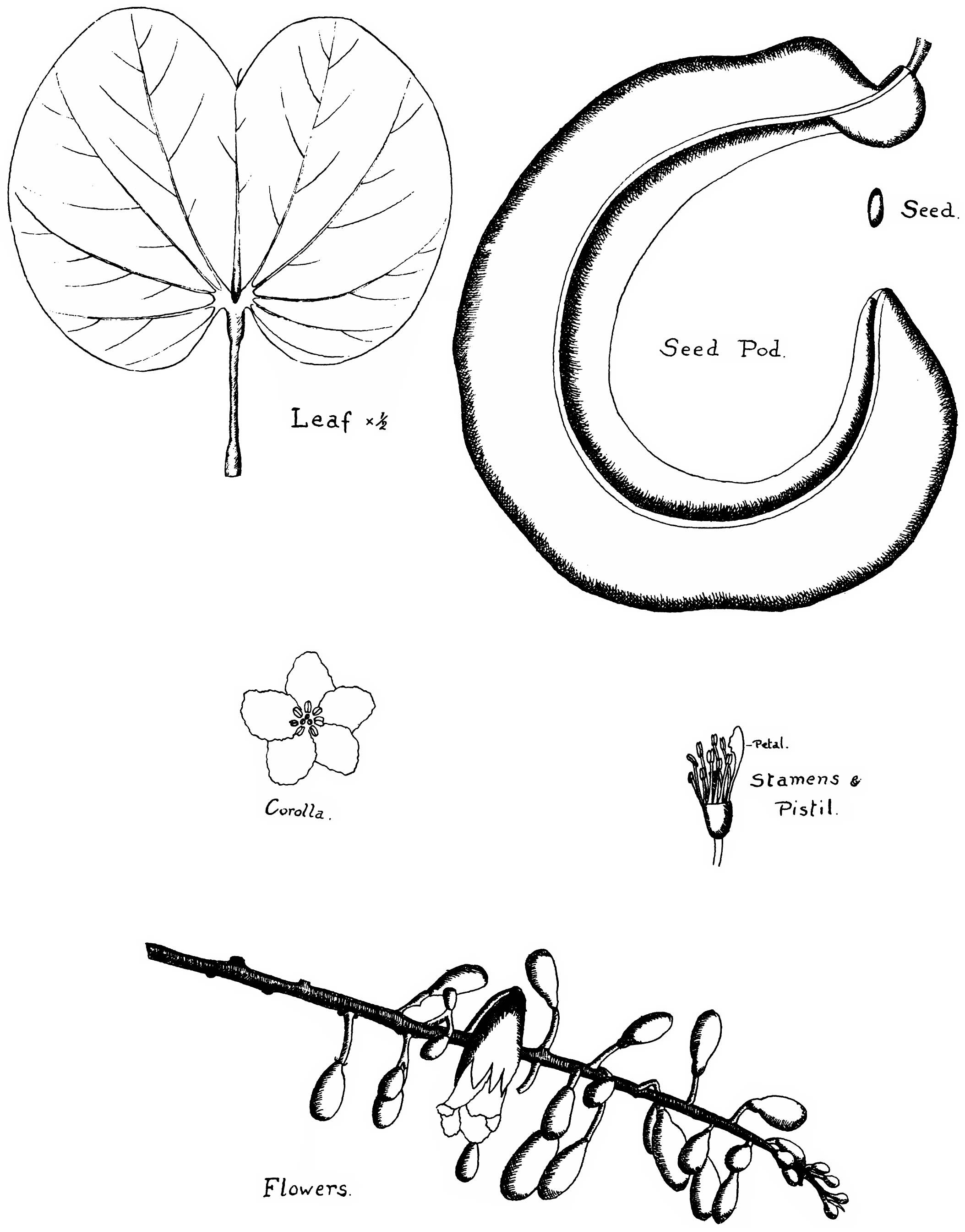 The Fruits are pods, at first green and sickle shaped, ripening to a bright orange and twisting into strange shapes. They are 4-6 inches long, 1 inch wide, concave on one side, convex on the other. They contain dark brown shiny seeds ⅜ inch long. The pods ripen in January and February and fall entire, rotting on the ground.
