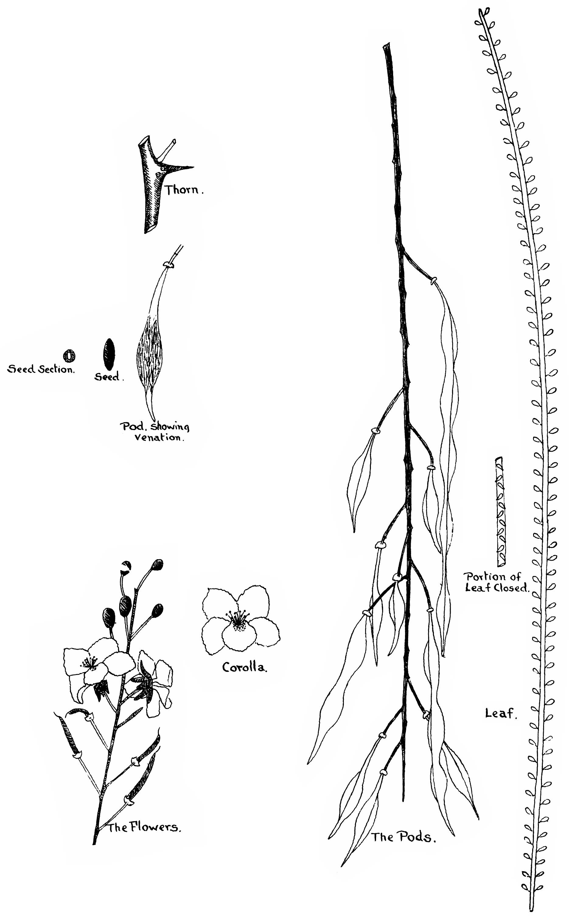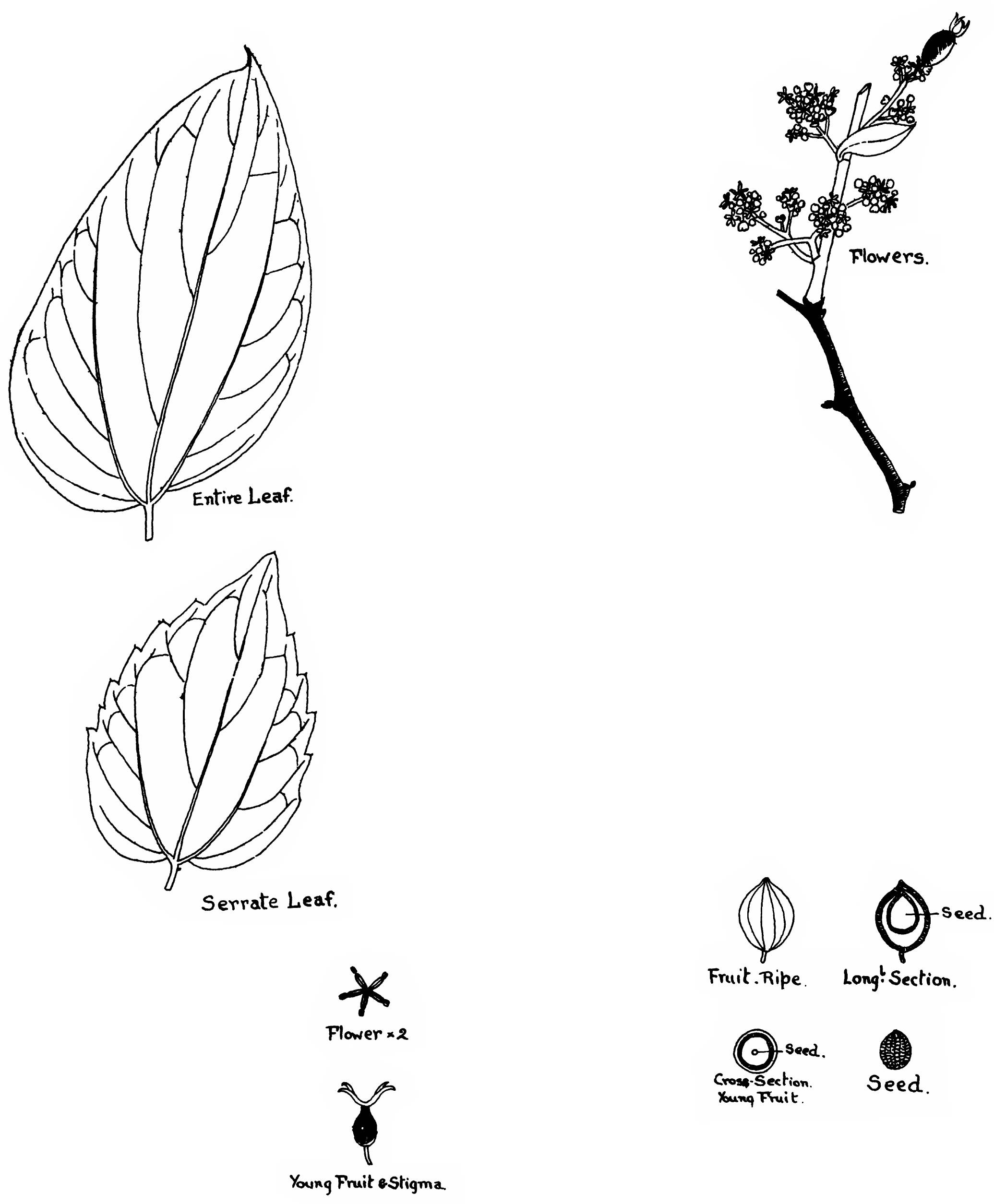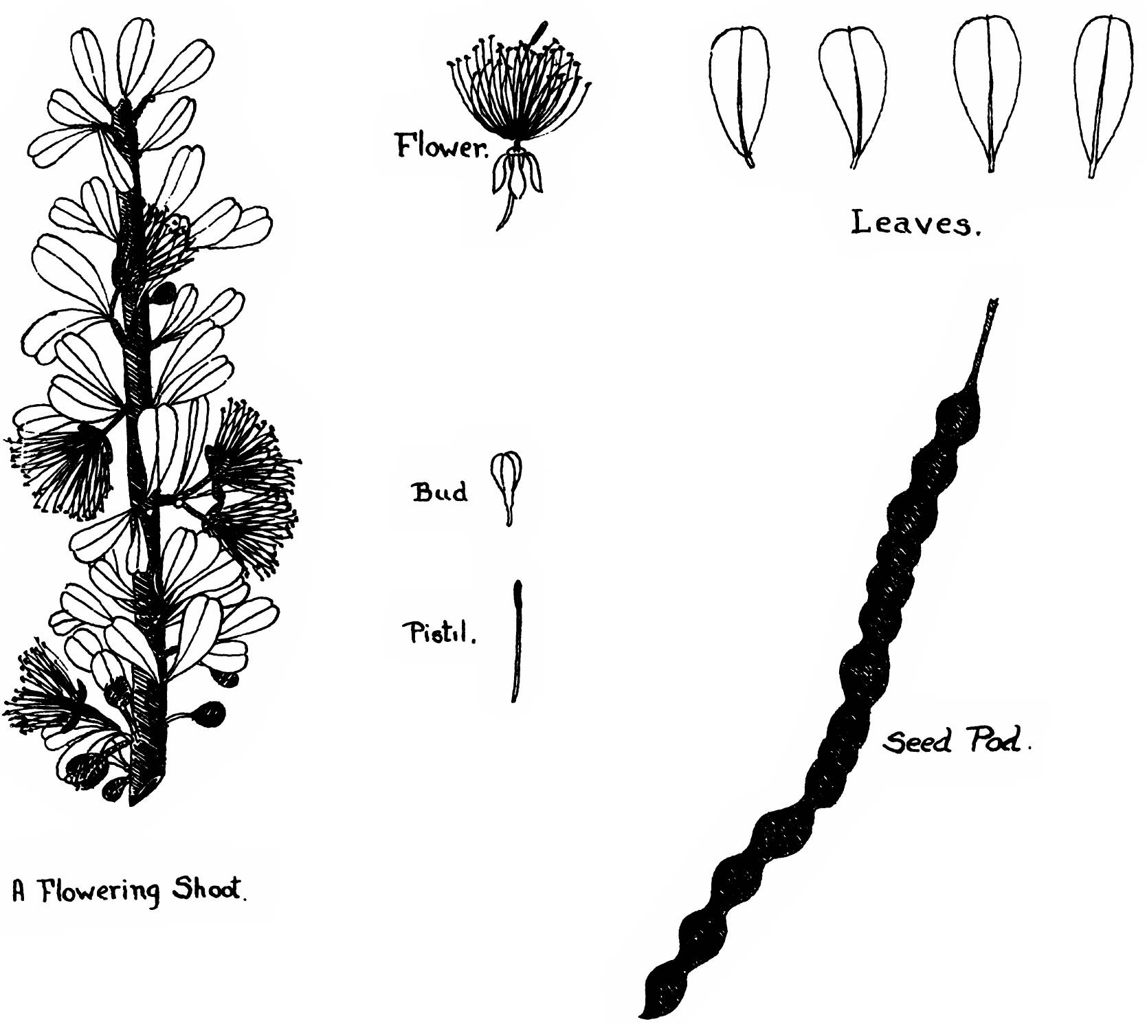 The text is supplemented by drawings of the flower, leaf, thorn, fruit and seed, sketched from the living specimens. Wherever possible the drawings are actual size to avoid calculations from enlarged or reduced figures, but a number have been enlarged to show structures, or reduced owing to their actual size. In several cases sections of various parts have been made to illustrate peculiarities of structure, a pocket lens being used for this purpose, though practically all the parts drawn are visible to the unaided eye.