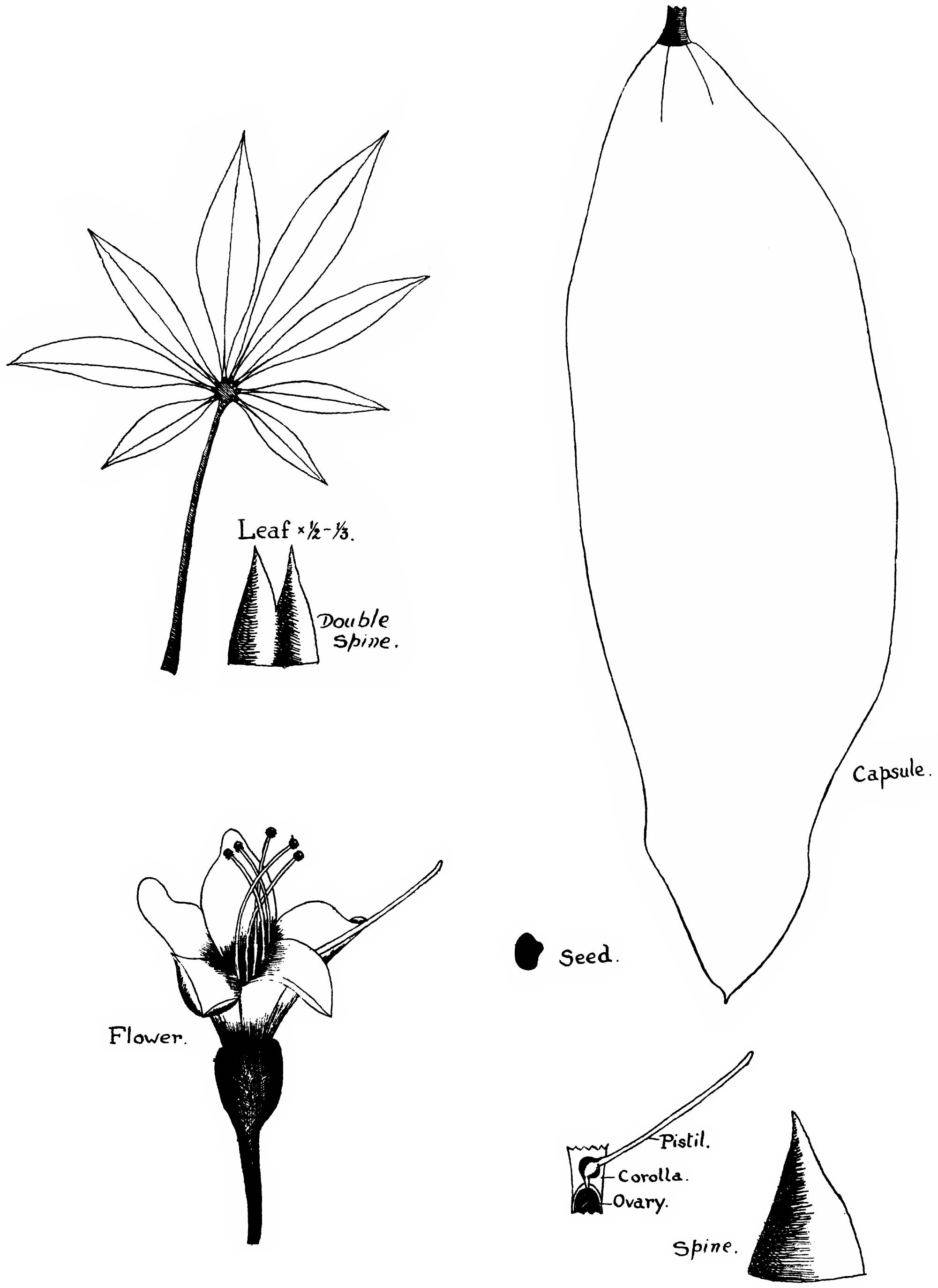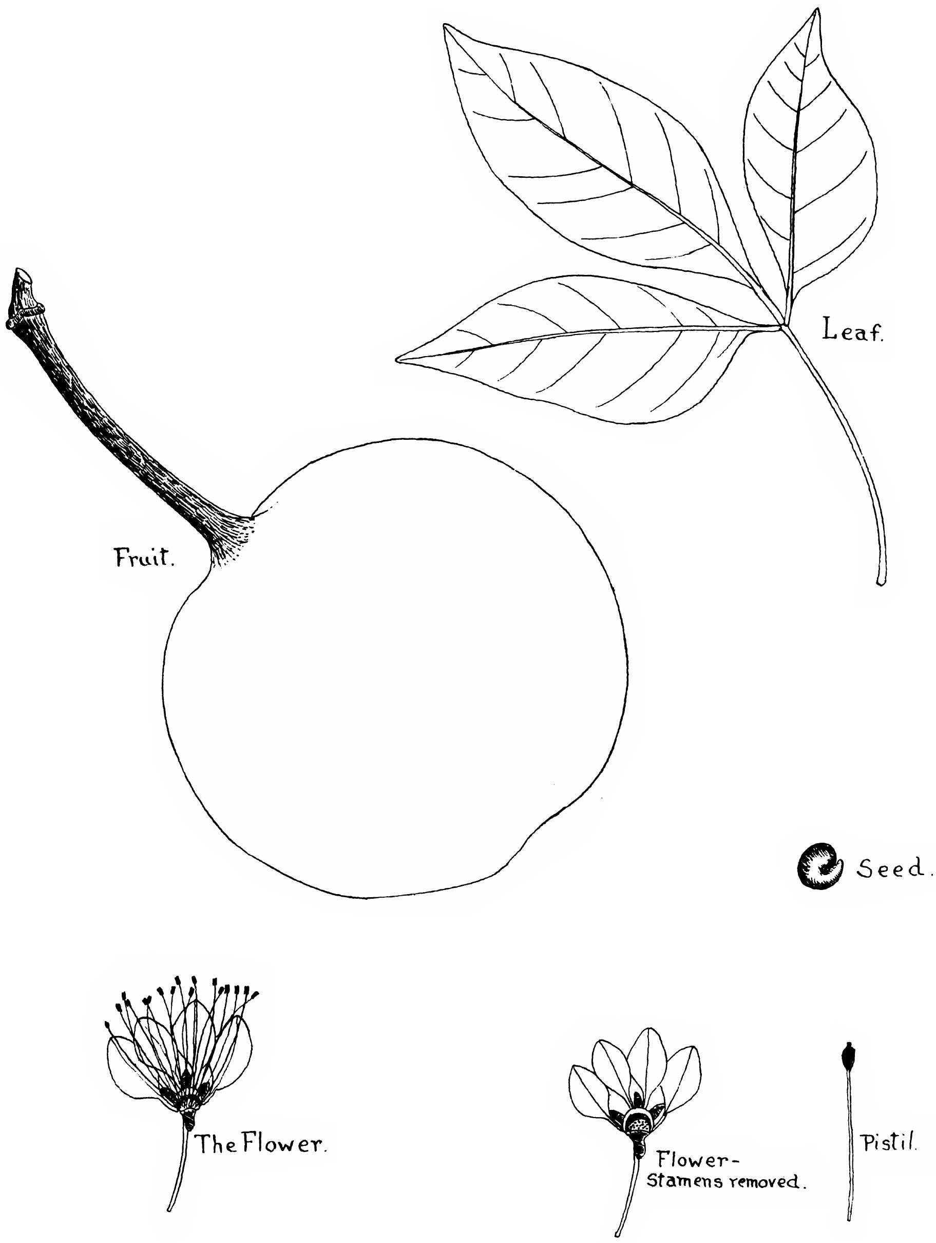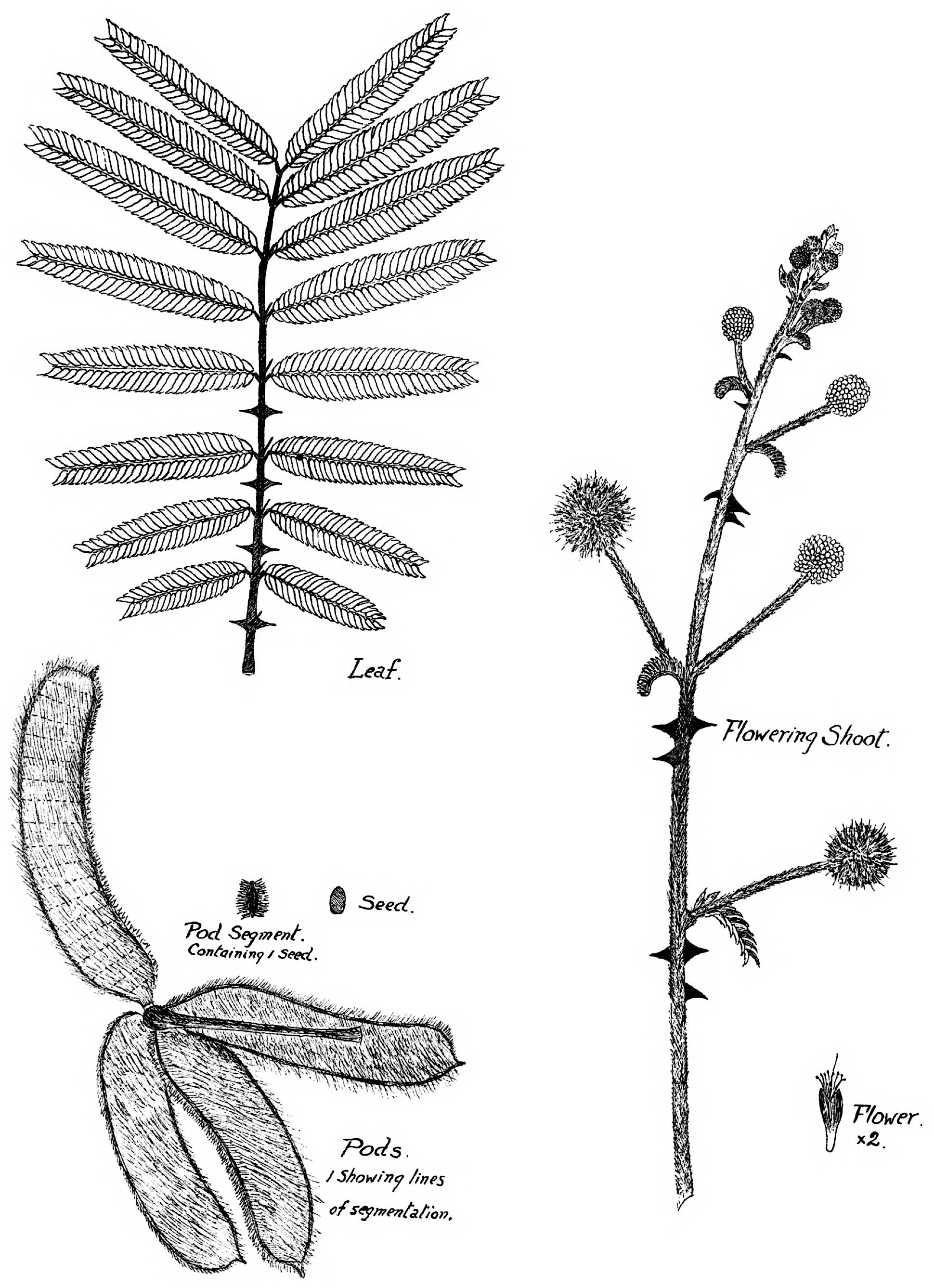 The text is supplemented by drawings of the flower, leaf, thorn, fruit and seed, sketched from the living specimens. Wherever possible the drawings are actual size to avoid calculations from enlarged or reduced figures, but a number have been enlarged to show structures, or reduced owing to their actual size. In several cases sections of various parts have been made to illustrate peculiarities of structure, a pocket lens being used for this purpose, though practically all the parts drawn are visible to the unaided eye.