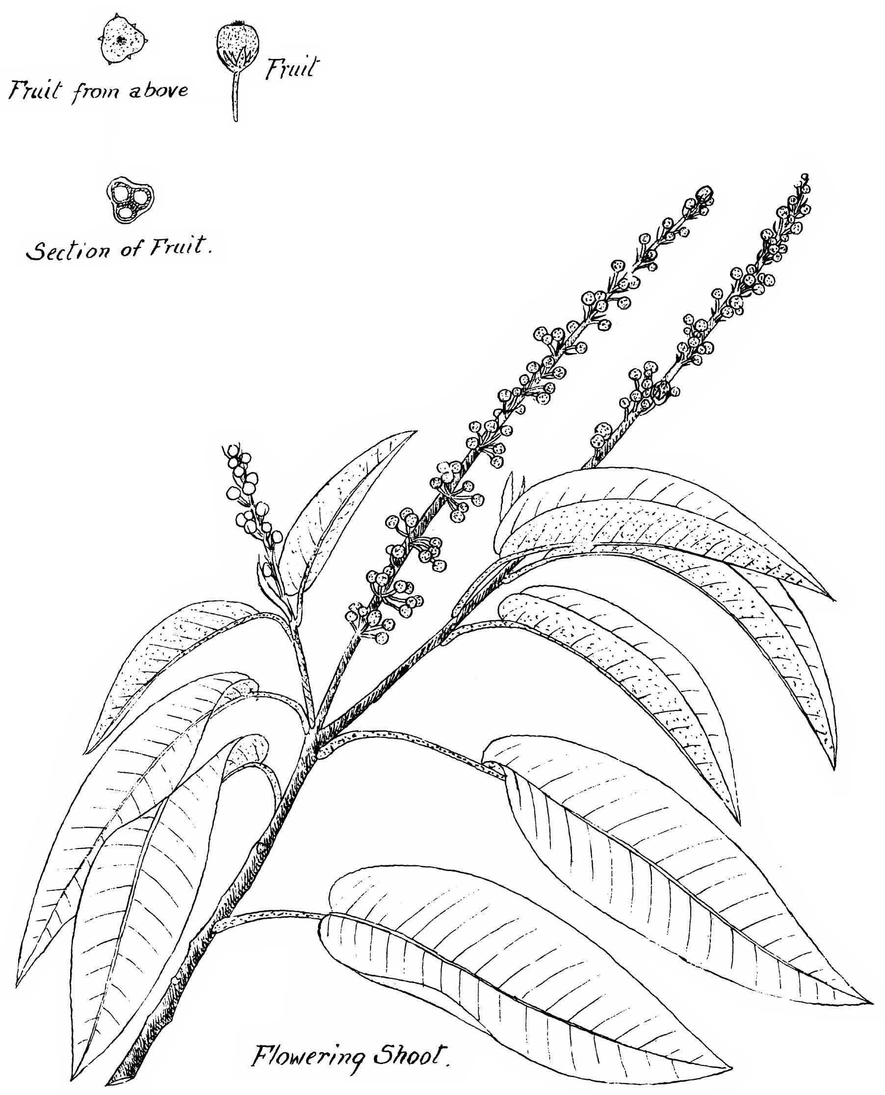 The Flowers, from October to December, are in dense spikes 3-4 inches long, scented. The lower inch of the spike is flowerless. Several spikes are borne at the twig ends. Each flower has a 5-lobed cream-coloured calyx with pink centre, 40-50 stamens, and a short pistil with slightly clubbed stigma.