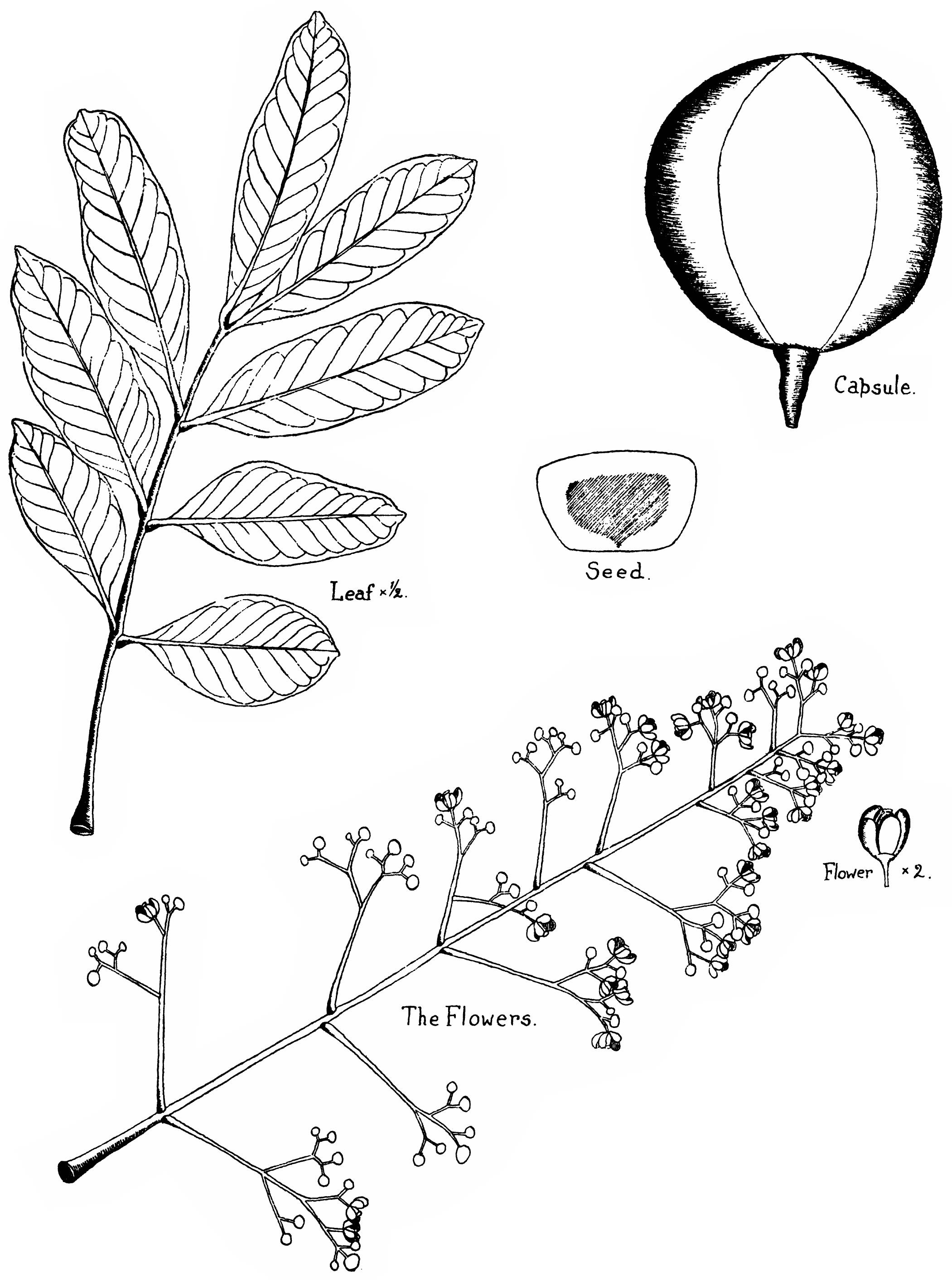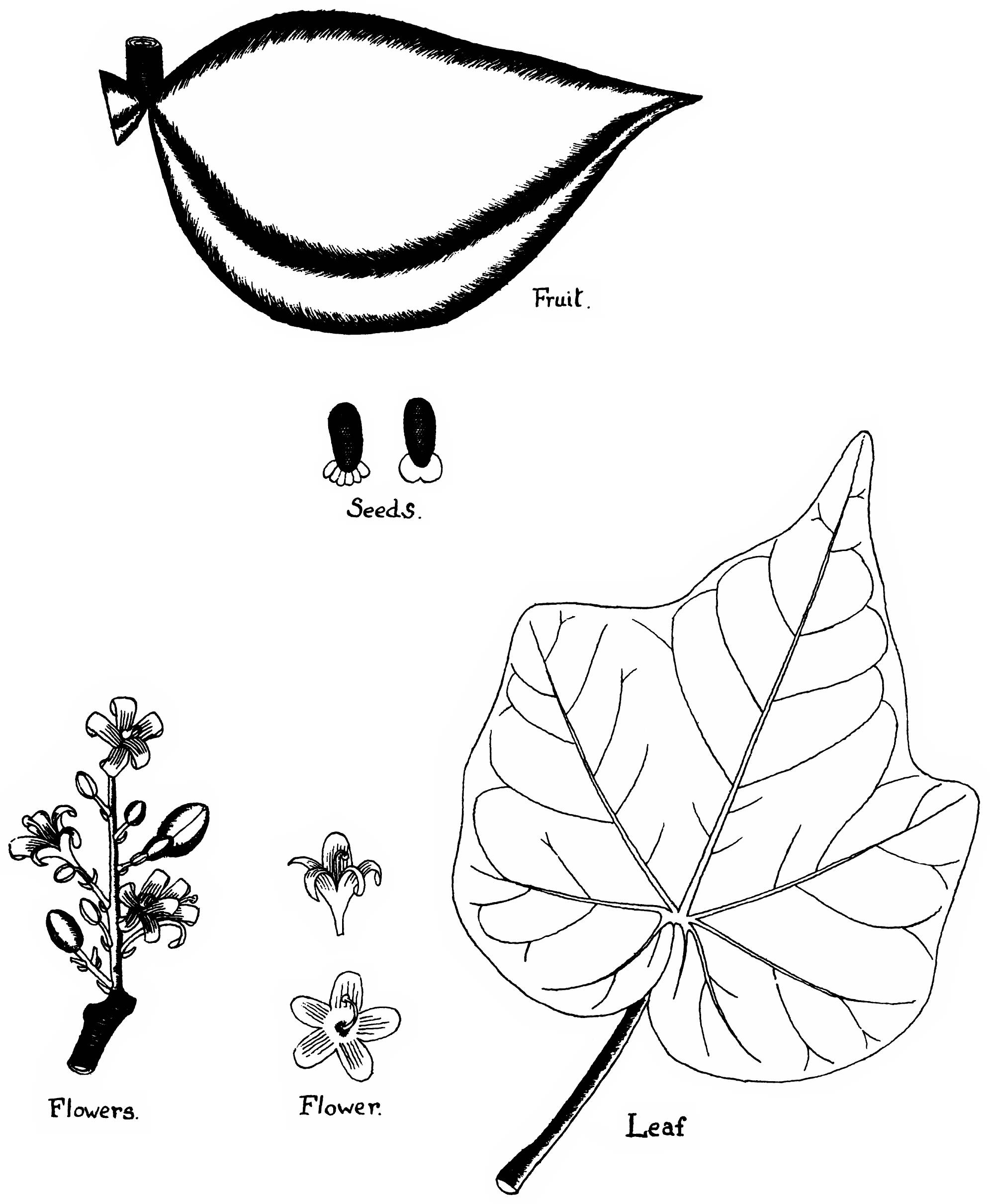 The Wood.—The heartwood is reddish with long, vertical streaks of black and brown in the pores. The sapwood is yellow with an orange grain. In transverse section the rings are indistinct, the pores are open and numerous, the soft tissue in wide and narrow festoons plainly visible to the unaided eye. The wood is hard, splits easily, is straight-grained, not easy to plane and weighs 65 lbs. a cubic foot.