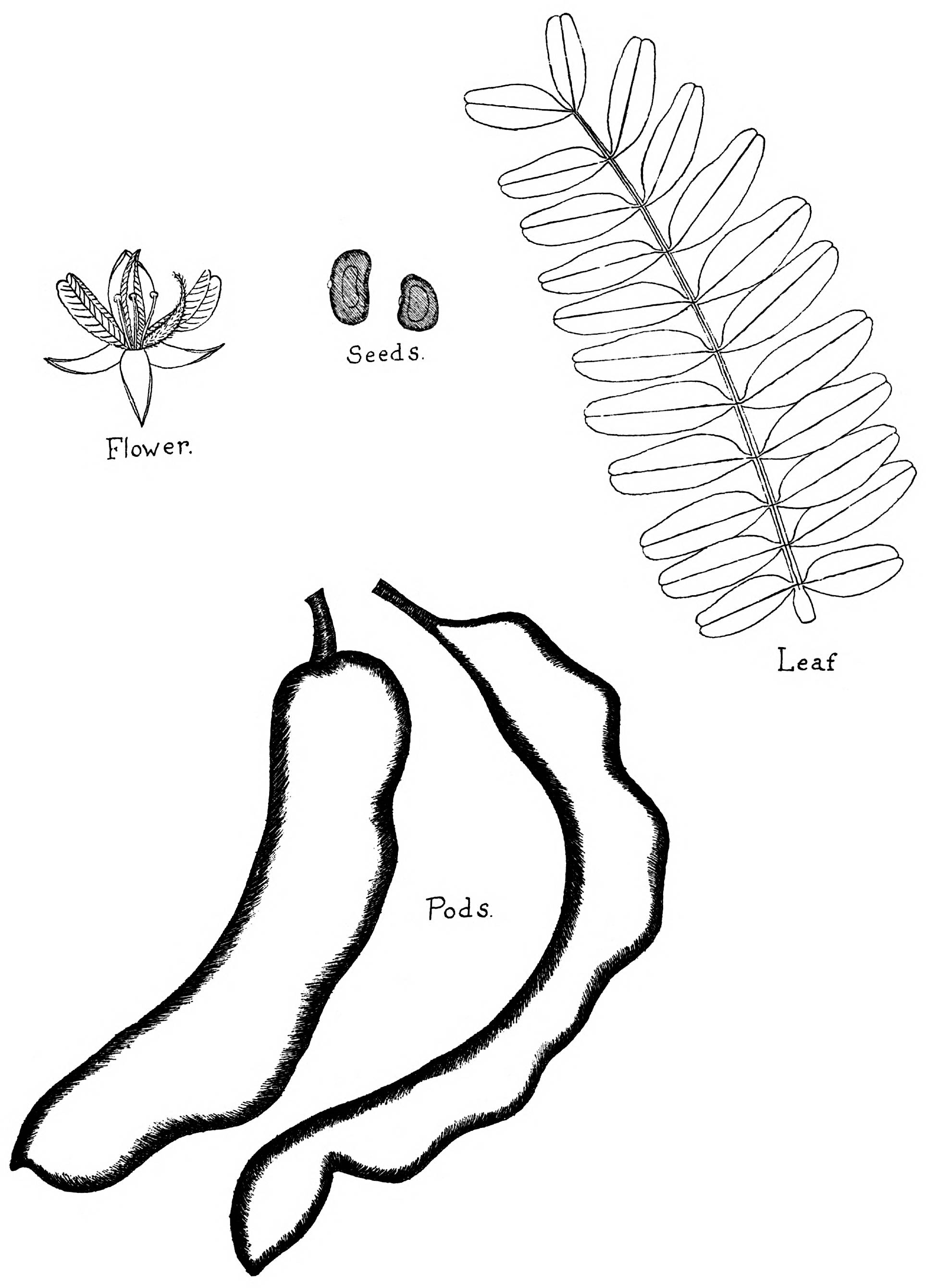 The Fruits are jointed pods, straight or sickle-shaped, with slightly embossed seeds. The pod surface is wrinkled and covered densely with a whitish bloom. The seeds, some 10-12 in a pod, are round, flattened, shiny and brown, ⅜ inch in diameter. The pods, ripening towards the end of the year, fall to the ground entire. They are the “Sant Pods” of commerce.