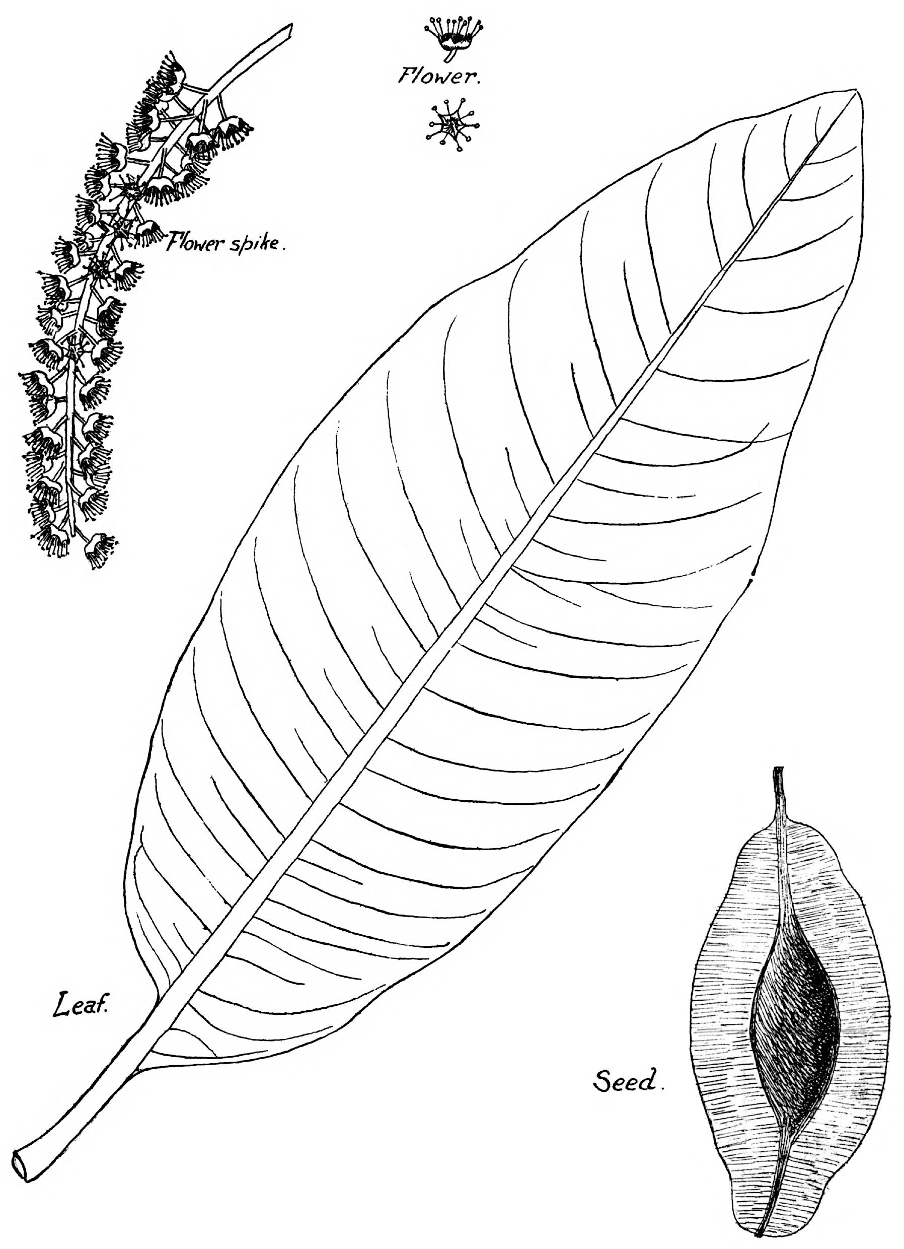 The Wood is a very dark brown, with almost black streaks. The sapwood is white. In transverse section the rings show as irregular dark bands, the pores are small, few and connected by very thin lines of soft tissue, the rays are very fine, waved and unevenly spaced, invisible to the naked eye. In vertical section the rings show as bands of dark brown and almost black and there are lighter areas. The wood is hard, fibrous and bad to saw, not easy to plane, though the finished surface is smooth and will take a good polish. The long fibres pick up badly in places. The weight is 52 lbs. a cubic foot.