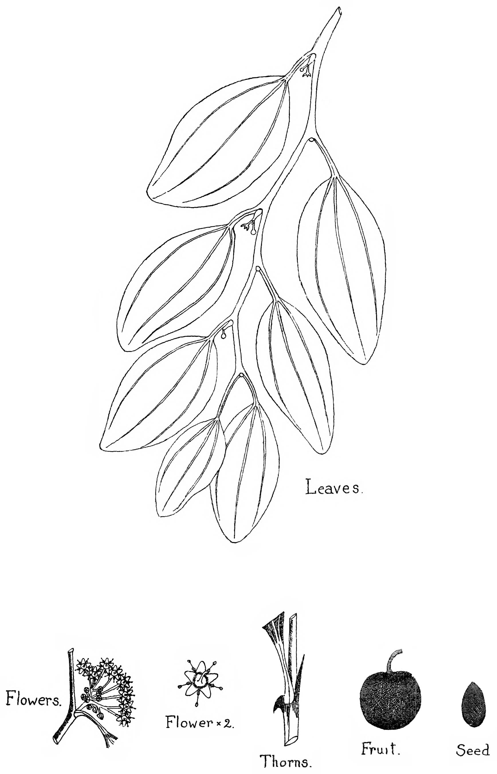 The Thorns are in pairs, under ½ inch long and slightly recurved. They are pale brown with white bases. The young tree is armed all over, but as the tree ages the thorns leave the stem and finally the higher branches are free as if protection seemed to be unnecessary at a height.