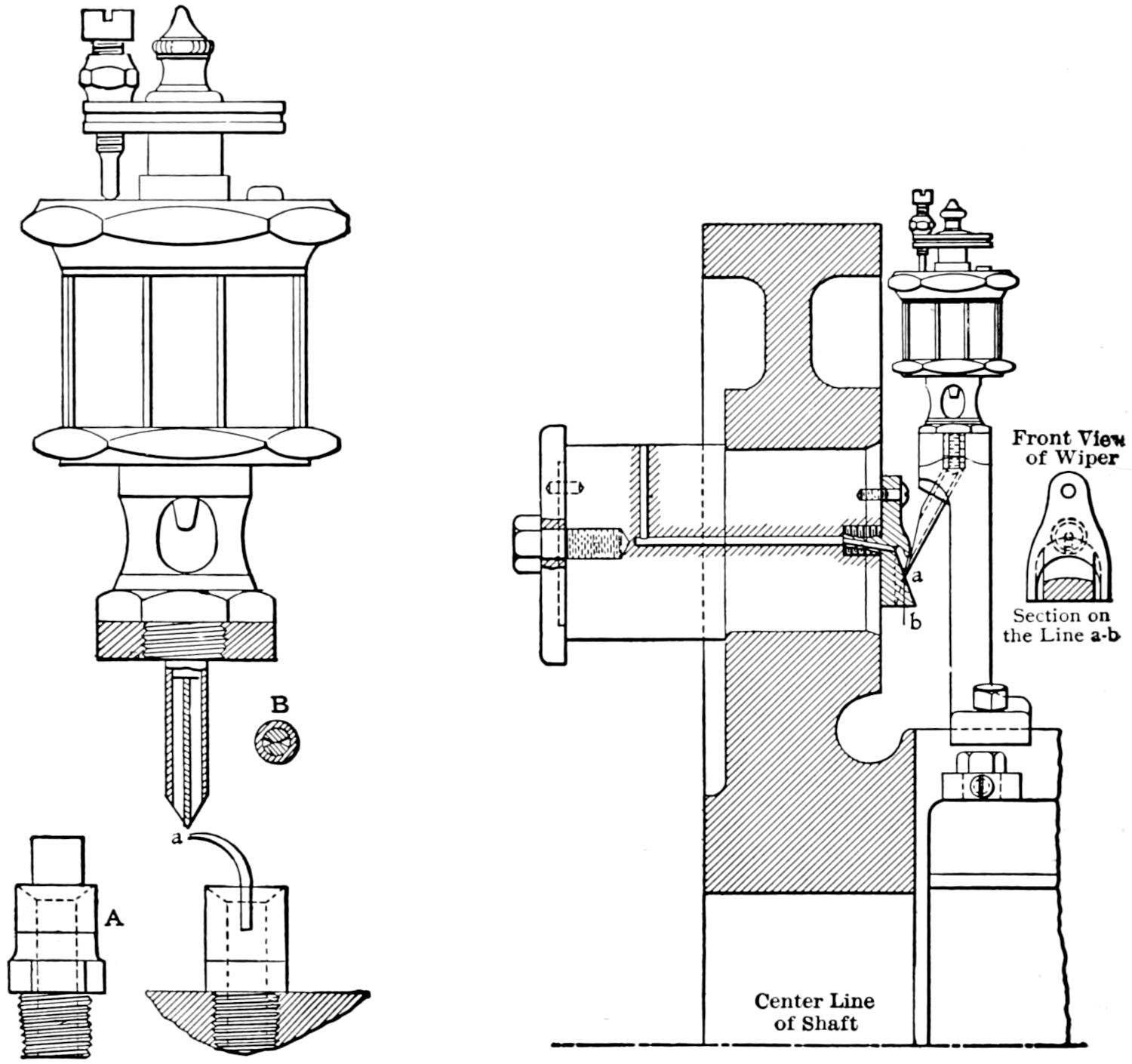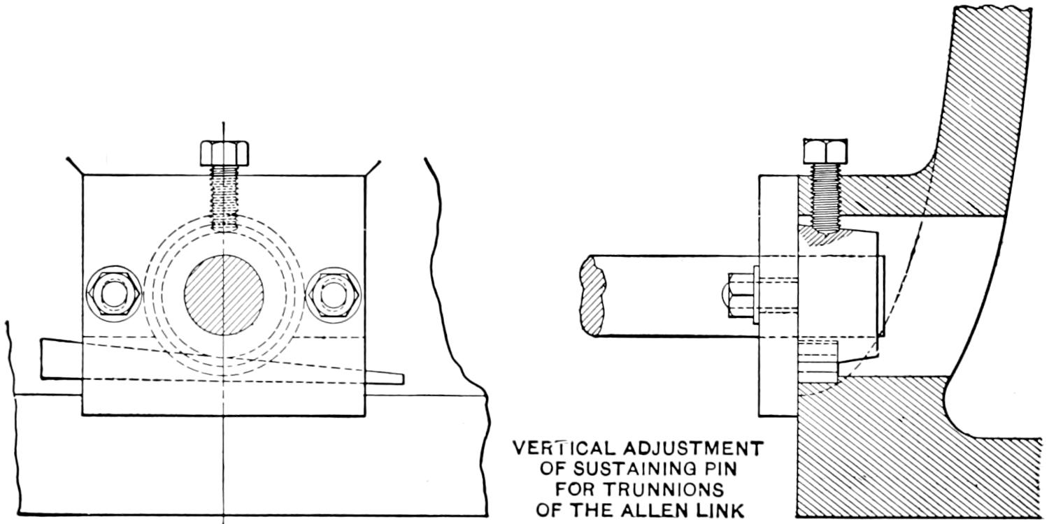 The hole was then enlarged by use of file and scraper, its adjustment being proven as the work progressed by frequent trials of level placed within the hole, at various points in the revolution of the shaft. Finally, the trial plug was worked[329] into the hole and used as a surface plate, the “high” spots being scraped down and the plug found to line with the shaft and the hole by caliper, found to be approximately ³⁄₁₀₀₀″ smaller than the shank of the pin. The pin was then forced in and found to stand nearly true. The small untruth was easily corrected in riveting up the back and the pin was thrown approximately ²⁄₁₀₀₀″ away from the center line of shaft rotation to offset the deflection that would be occasioned when running by the impact of the steam admission on centers.