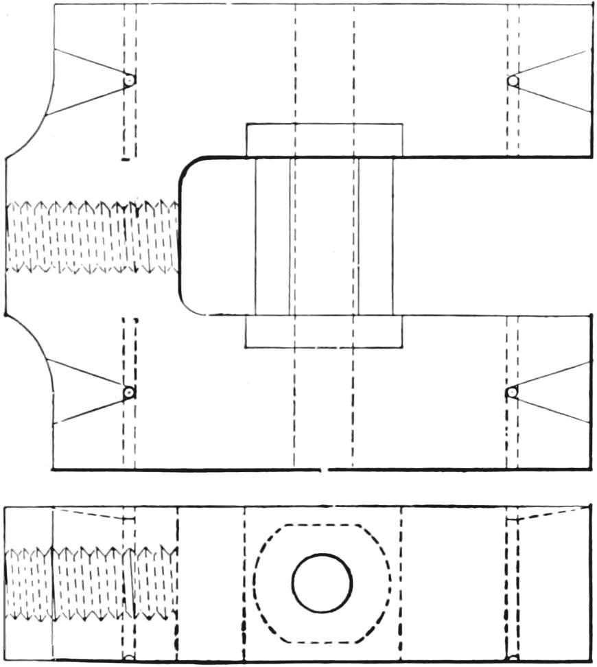 The old pin had to be taken out and the new one put in. The exact diameter of the old shank was not definitely known. It was thought advisable therefore, to make the new shank about ¹⁄₃₂″ larger than the drawing dimension; so it would surely be large enough to admit of drawing the hole which I proposed to do by hand. Before leaving the works I had a hollow cast iron cylinder or trial plug made, about twice the depth of the crank pin hole in length, about ¹⁄₁₀₀″ smaller than the shank of the new pin and slightly tapered at one end.