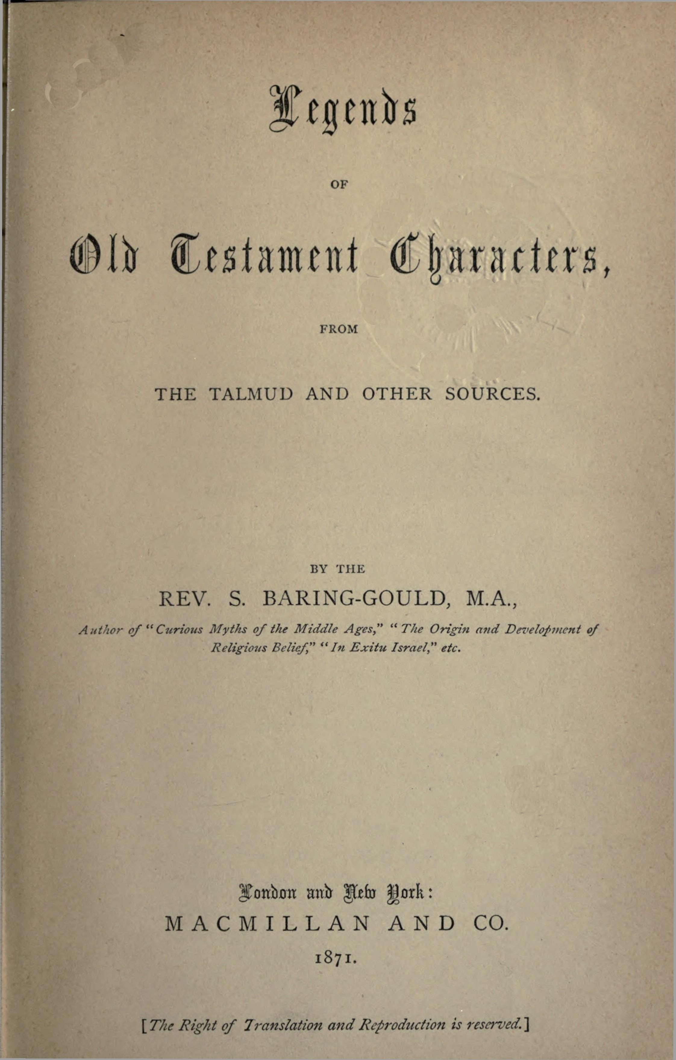 The Author is not aware of any existing collection of these viilegends, except that of M. Colin de Plancy, “Legendes de l’Ancien Testament,” Paris, 1861; but he has found this work of little or no use to him in composing his volume, as M. de Plancy gives no reference to authorities; and also, because nearly the whole of the contents are taken from D’Herbelot’s “Bibliothèque Orientale” and Migne’s “Dictionnaire des Apocryphes.”