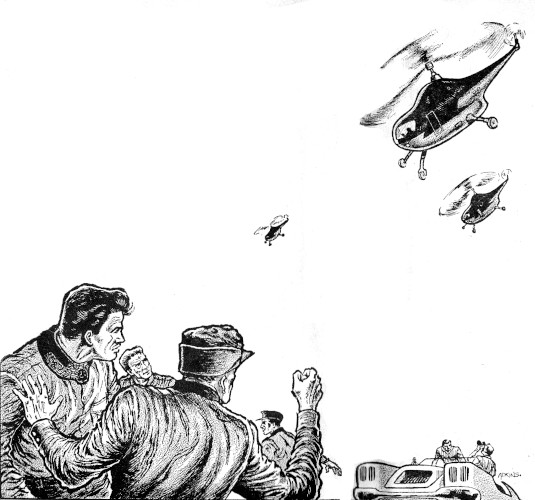 Men jumped out of the helicopters. MacFarland's driver reversed his engine. The convoy screamed to a halt. The men jumping from the copters hit the ground and threw themselves prostrate. In the tall grass they could be anywhere. The helicopter overhead switched off its light.