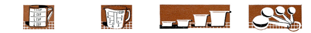 | Dry Measuring Cup has no rim ... 1-cup line is even with top. Use for any dry ingredients or shortening. | Liquid Measuring Cup ... has rim above the 1-cup line. Use for measuring any liquid ingredients. | Graduated Measuring Cups ... ¼, ⅓, ½, 1 cup. Use for part-cups of any dry ingredients or shortenings. | Measuring Spoons ... ¼, ½, and 1 teaspoon, 1 tablespoon. Use for less than ¼ cup of any ingredient. |