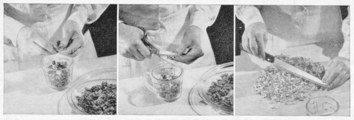 | 1 Sift flour through large open sifter (to aerate it) onto square of paper before measuring. | 2 Then spoon sifted flour lightly into a “dry” measuring cup ... heaping it up. | 3 Level off cup with straight-edged knife. Don’t shake cup. This is important! |