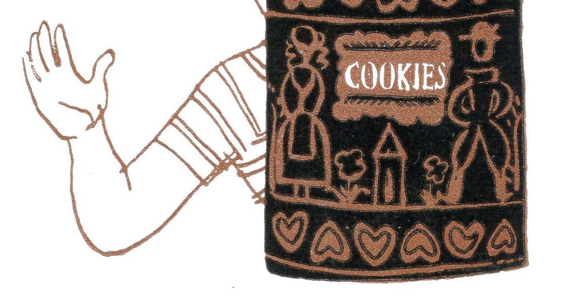 I’m as delighted with this quaint addition to our cooky collection, from Ken MacKenzie, as is the collector of old glass when a friend presents her with some early thumbprint goblets.