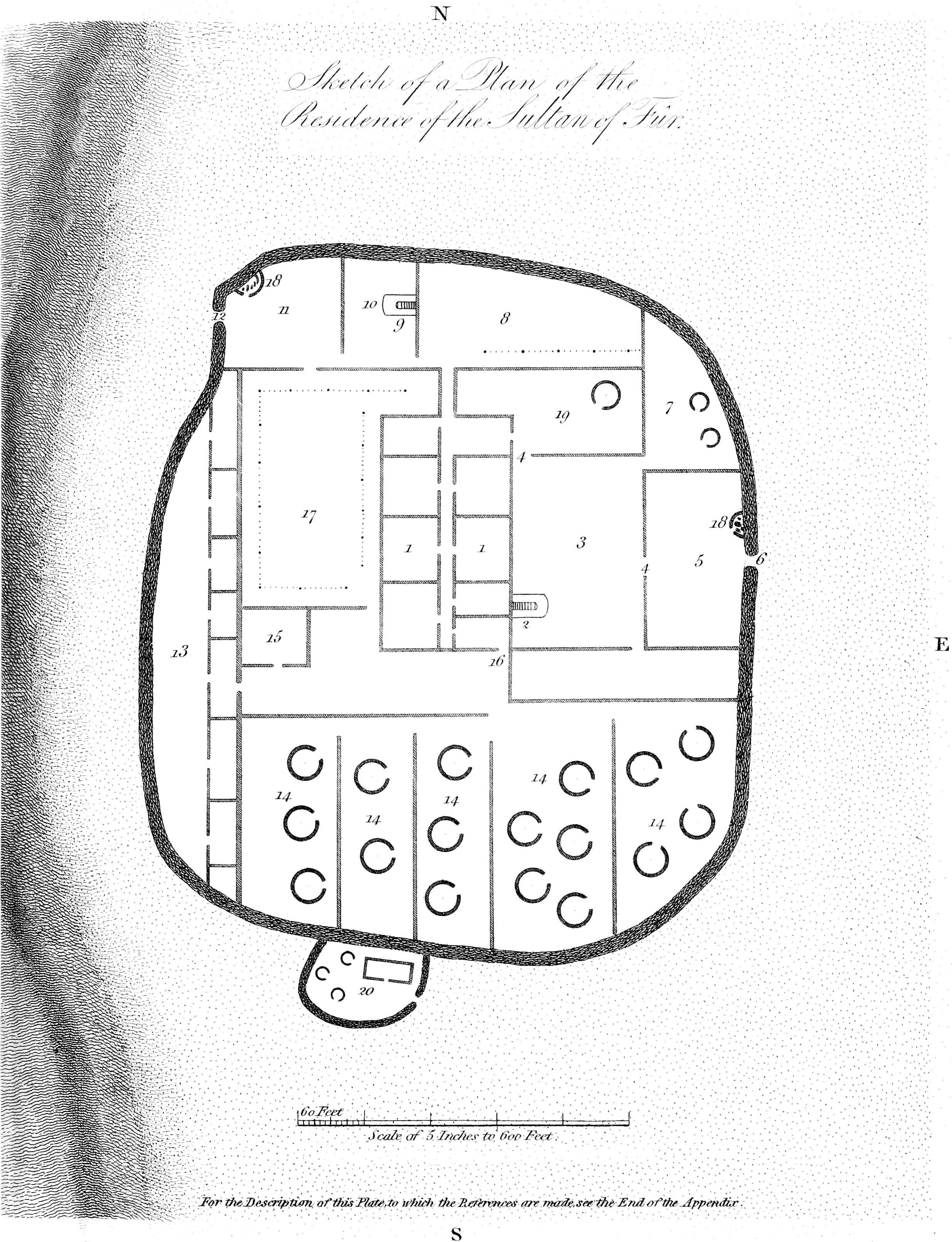 14. A large court of irregular form filled with a multitude of small apartments for the women; they pass through the two gates marked w to fetch water, but have no other outlet. Each of the principal women has a large apartment, surrounded by a number of smaller ones for her slaves; there are also apartments for cooking.