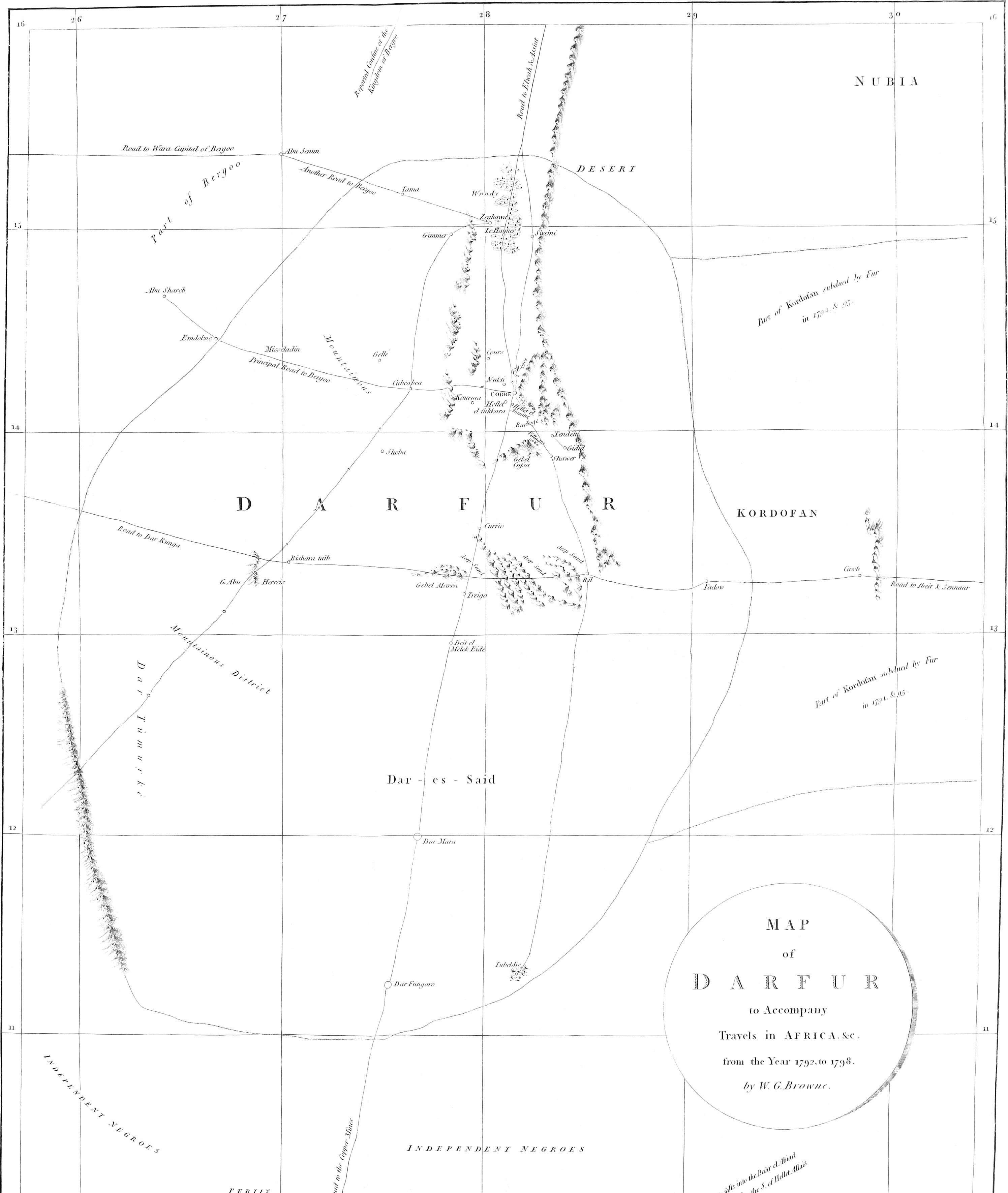 The information received, previously to his departure in 1793, taught the writer to expect, from having chosen the route of what is called the Soudân Caravan, the choice of a free passage to Sennaar, which would, without much doubt, have secured him an entrance into Habbesh, under the conduct of the Fungni, who trade there: for the Fûrian monarch, had his favour not been withdrawn in consequence of false insinuations, would readily have accorded a safe-conduct through Kordofân, which was all that circumstances required. The being removed a few weeks journey too far to the Westward, was no objection, when he reflected on the[xv] confusion then reigning at Sennaar, and that in proportion as the road he took was indirect, the less suspicion would be entertained of him as a Frank, the greater experience he must acquire among the people of the interior, and the more easily he might be suffered to pass as a mere trader.