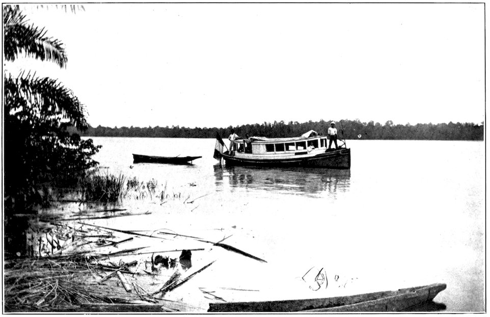 327Our pursuers were rapidly drawing nearer and were almost upon us. They included, I presume, every heathen savage in the town, each of them yelling like ten, and perhaps engaged meanwhile in loading their guns with such deadly material as broken pots and barbed wire. At last, “All right,” shouted the mate; and we moved off just as the enemy in a fleet of canoes came round the last curve of the narrow river. I had made our party, including Nze, lie down flat in the bottom of the launch; only Ndong Koni at the wheel and myself at the engine remained standing. Despite rage and excitement I did not expect that they would fire upon us. But I very much feared that a stray shot, intended only to intimidate us, might do us as much damage as the “bow drawn at a venture” did to a certain king a long time ago. We were soon beyond their range; and then Robert’s gladness and the unbounded joy of Nze were a sufficient reward for us all. For my part, I was exceedingly glad that Nze’s husband was present; otherwise an elopement would have been credited to me.