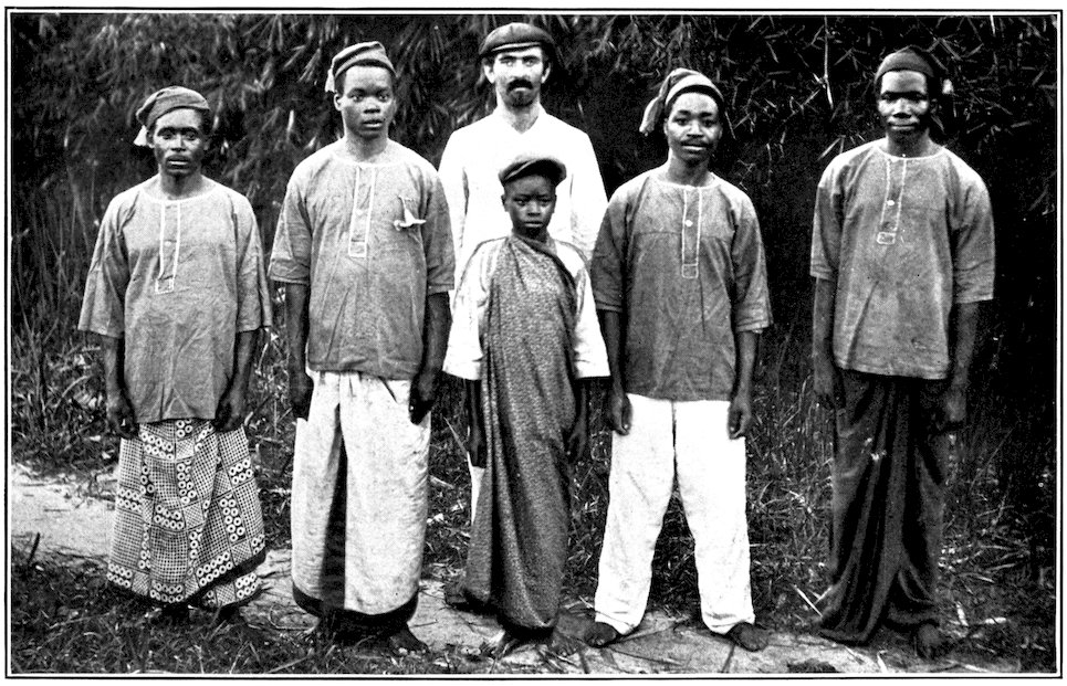 In the middle of the front row stands Amvama.  Behind him, on his right, is Ndong Koni.  The tall young man is Robert Boardman, the blind catechist.