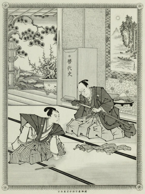 Sennoske, although greatly excited and incensed, had succeeded in repressing any outward signs of excitement or anger; he had spoken with quiet dignity, and when referring to the man whom he had left in such a dejected state his tones became tender and pathetic. It appeared to him that the whole proceeding was a deliberate attempt to deprive him of his matchless blade; yet—to his honor be it said—at the moment, the idea of its possible loss troubled him less than the thought of the probable effect of that loss on his old retainer. His solicitude for Yamagawa caused him to be wary, and to show more moderation in his speech than he otherwise would have done, in view of the arrogant manner in which he had been treated. The next answer which he received, however, was well calculated, in its[127] cold, sneering, and evidently studied insolence of tone and bearing, to make him lose every vestige of self-control.