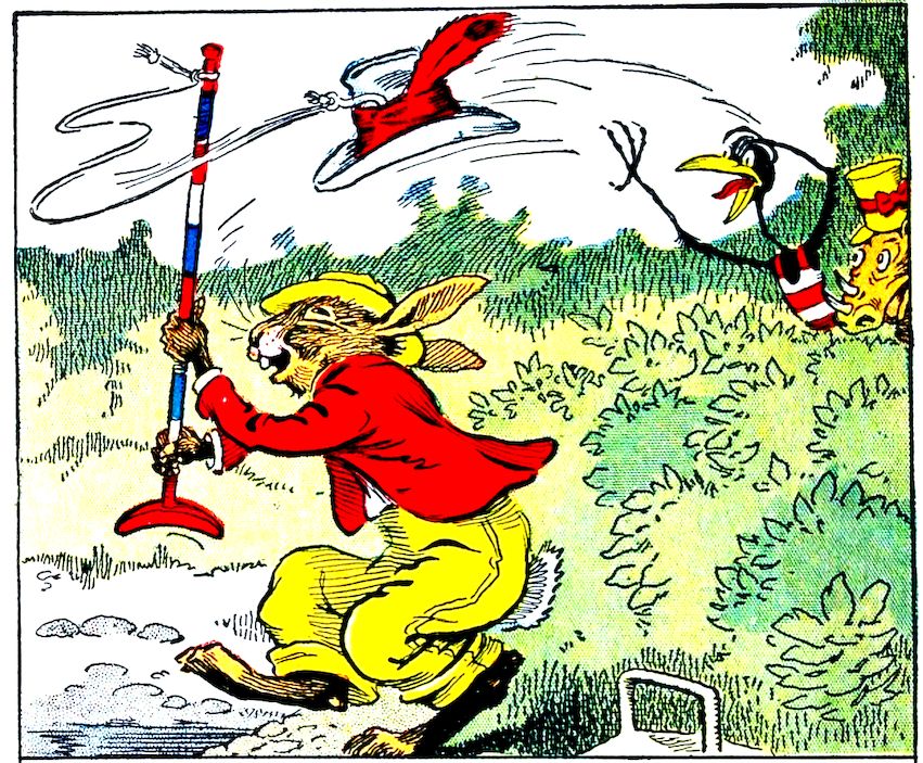 “Dear me hum suz dud and some slippery eels!” cried Uncle Wiggily. “What is this I have caught without even wetting my hook in the brook? I declare! It’s a fine hat! I’ll take it home and Nurse Jane can fix it up for me! Hats cost money. Now I have a new one for nothing!” Uncle Wiggily’s hook had snatched the hat off the head of the Skeezicks hiding in the bushes. And oh, how surprised the Skee was. Likewise the Pipsisewah. “Come on, let’s grab him quick!” cried the bad chaps. “He’ll catch us on the hook next!” So they got ready to get the bunny.