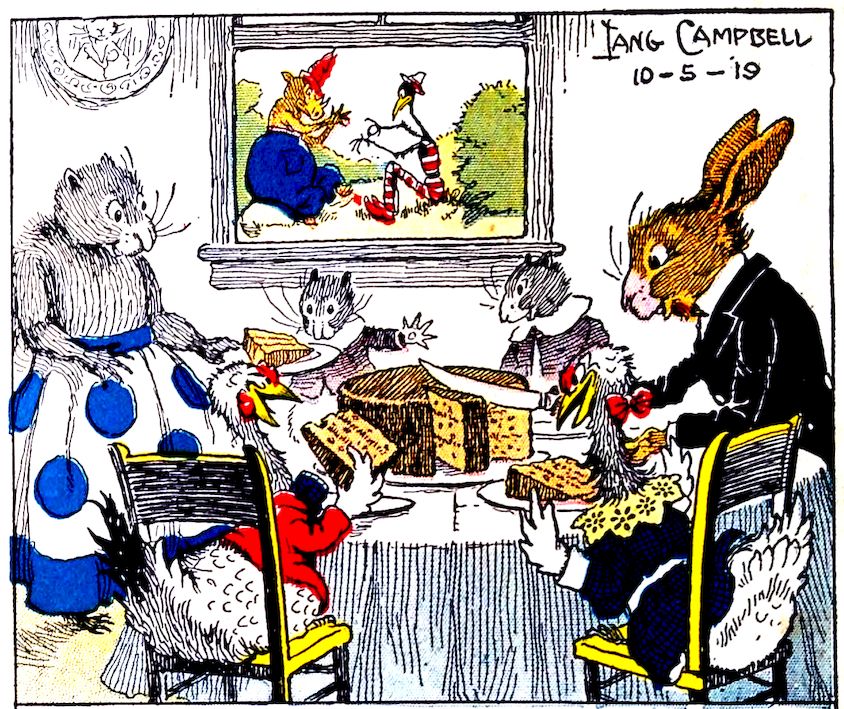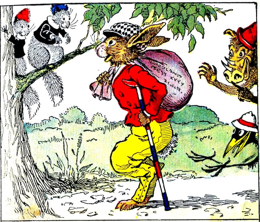 “Good-bye, Uncle Wiggily! Good-bye!” crowed Charlie the rooster chap, as the bunny rabbit gentleman’s bag was filled with chestnuts, and he started for his hollow stump bungalow. “Good-bye!” answered Uncle Wiggily. “When Nurse Jane bakes the nut cake, I’ll save you each a piece for having so kindly helped me!” The Pipsisewah, hiding behind a tree with the Skeezicks, heard what the bunny said and cried: “He must have a cake in that bag! When he isn’t looking, I’ll tear the bag open with my claws and the cake will fall out!”