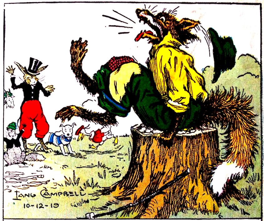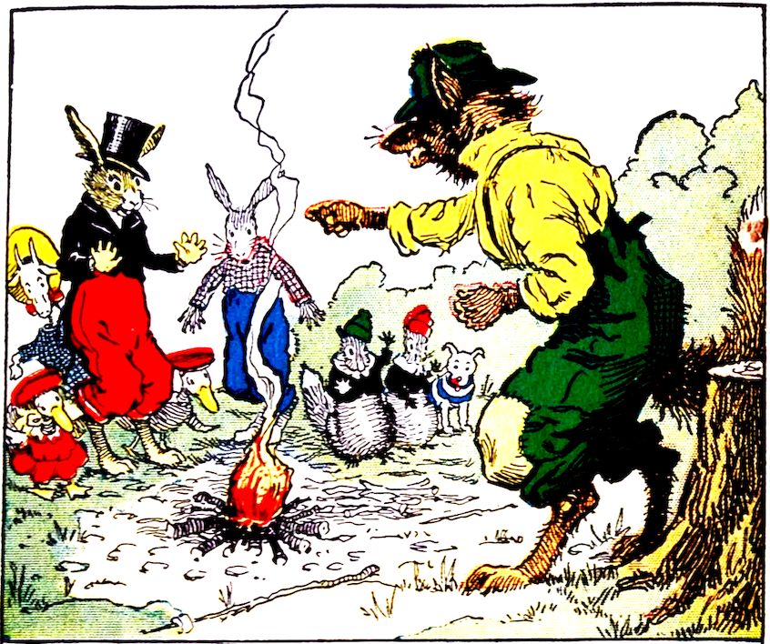 All of a sudden, just as Uncle Wiggily and the animal boys and girls were going to start roasting marshmallows again, right through the bushes jumped the bad old fuzzy tramp fox. Susie’s candy-fire had been put out, Nannie had been pulled loose from the stump, and here was new trouble. “How dare you roast marshmallows in my woods?” growled the fox. “We didn’t know these were your woods,” spoke Uncle Wiggily, politely. “Well, they are!” grumbled the fox. “And, just for that, I’m going to bite a lot of souse off your ears.”