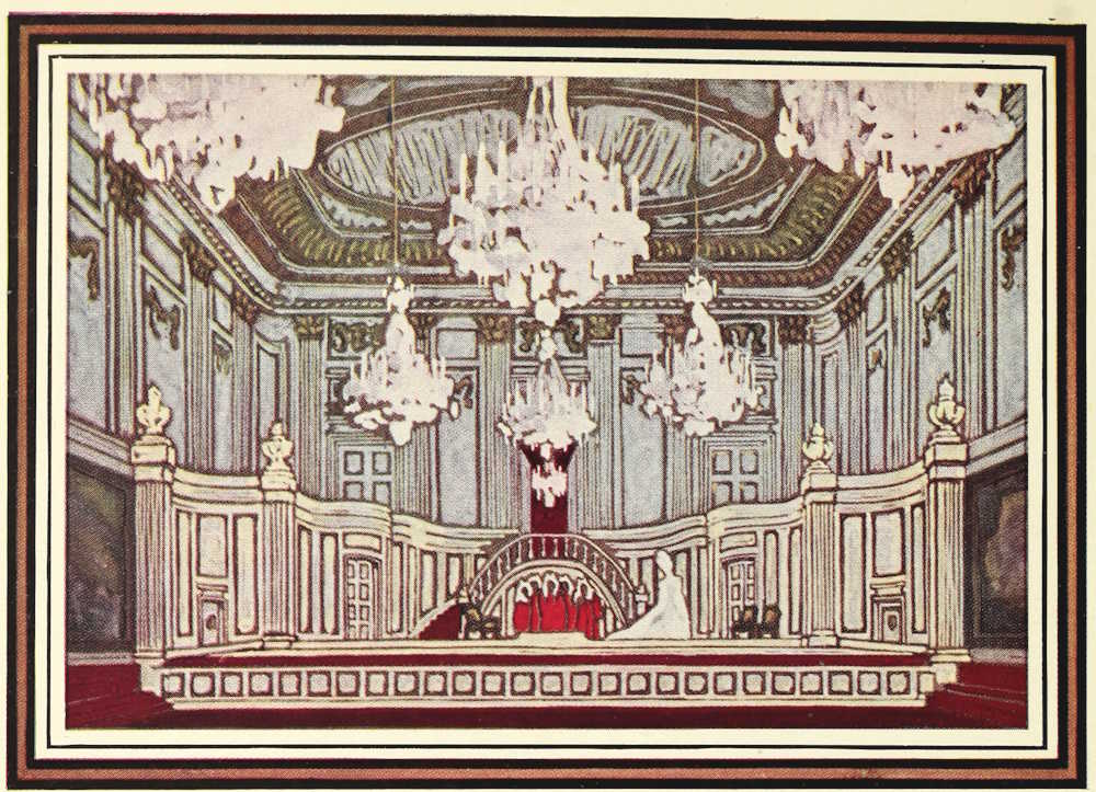| The Redoutensaal of Marie Theresa converted by the Austrian government into a theater without proscenium, machinery or scenery. Audience and actors lit by crystal chandeliers and surrounded by Gobelins and a permanent setting of baroque architecture. Mozart and Reinhardt bring to it an old and a new theatricalism. The principle applied to the stage and the plays of to-day. | ||