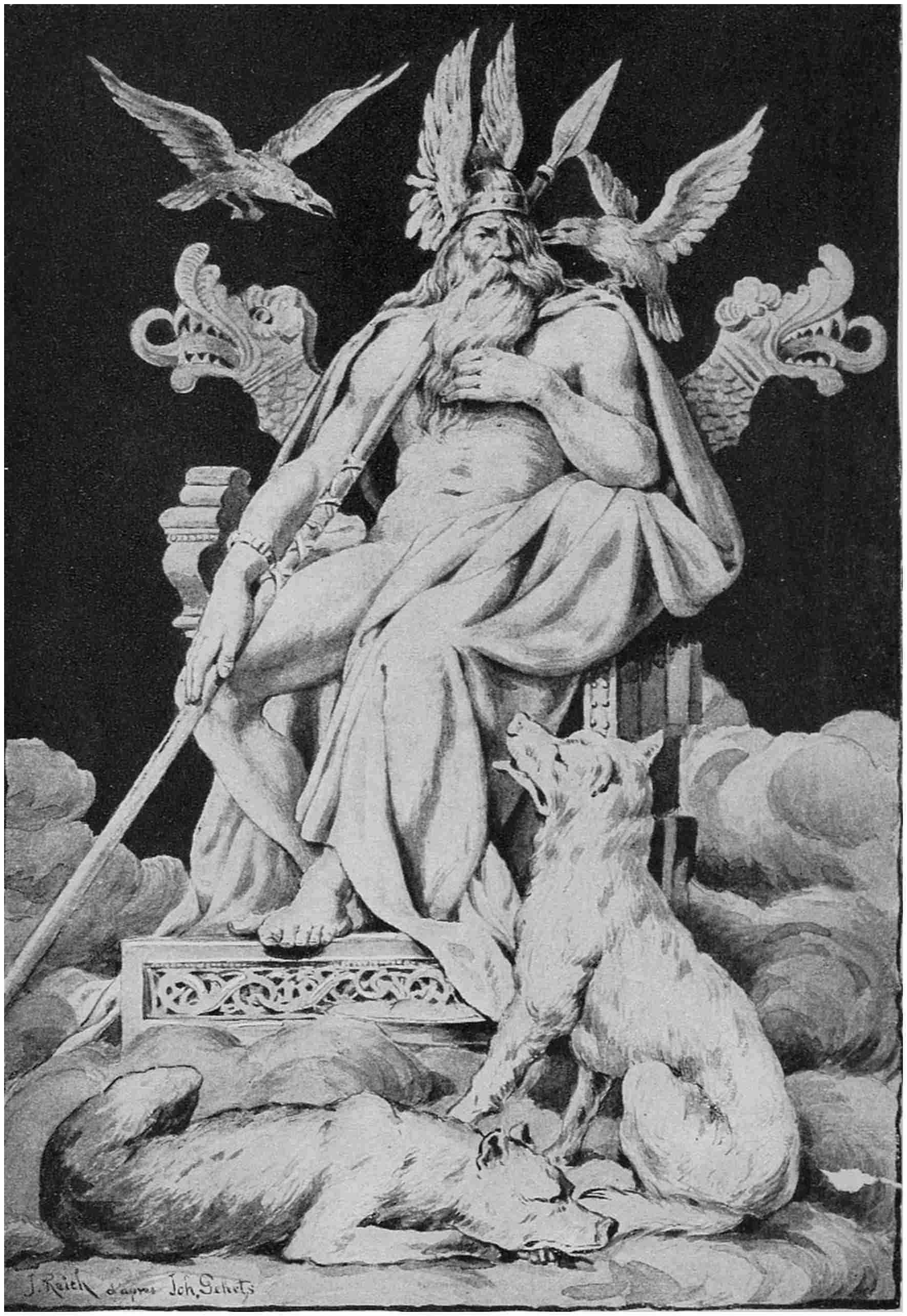 Jupiter, like Odin, was the father of the gods, the god of victory, and a personification of the universe. Hlidskialf, Allfather’s lofty throne, was no less exalted than Olympus or Ida, whence the Thunderer could observe all that was taking place; and Odin’s invincible spear Gungnir was as terror-inspiring as the thunderbolts brandished by his Greek prototype. The Northern deities feasted continually upon mead and boar’s flesh, the drink and meat most suitable to the inhabitants of a Northern climate, while the gods of Olympus preferred the nectar and ambrosia which were their only sustenance.