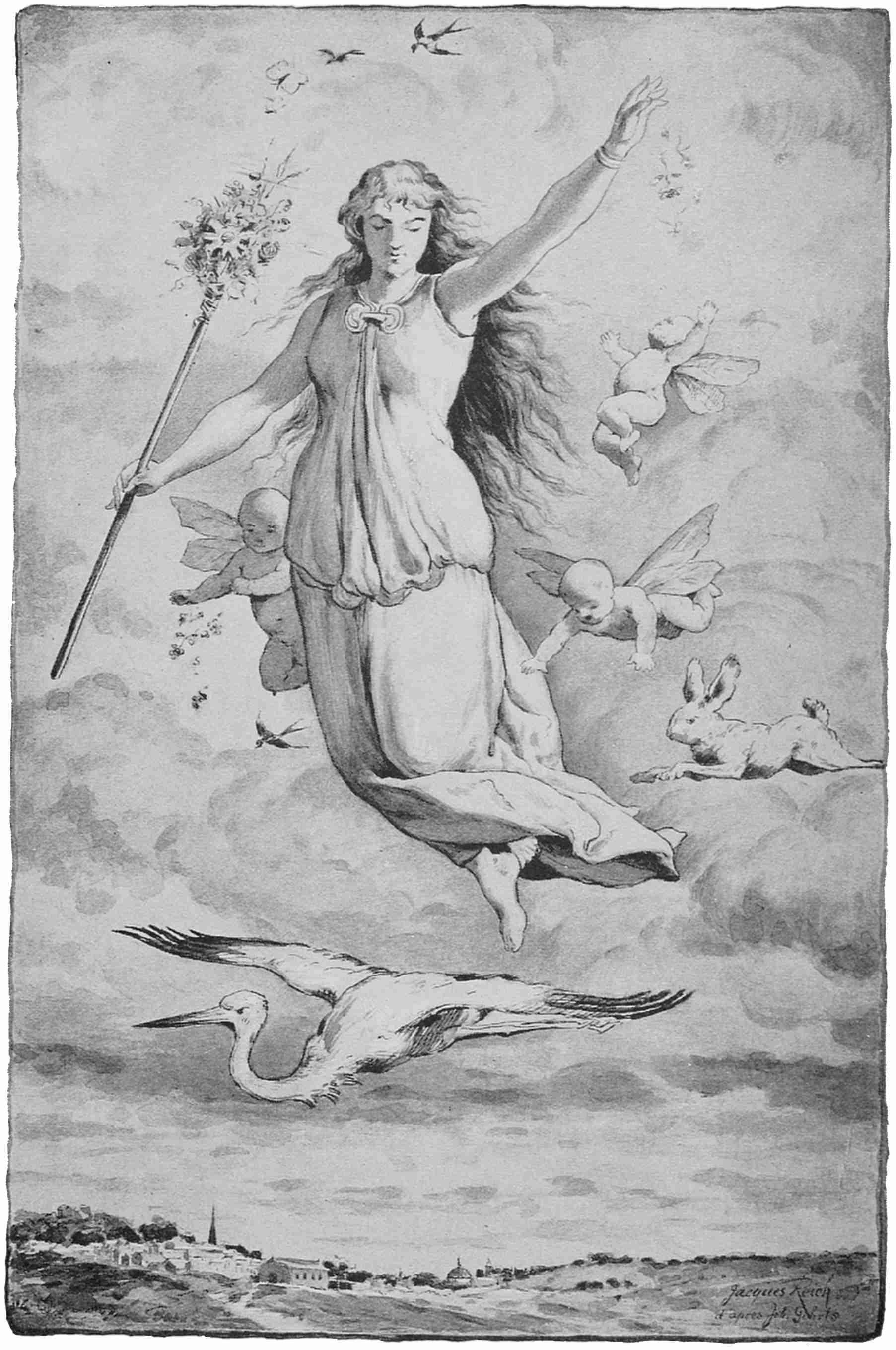 Frigga, like Juno, was a personification of the atmosphere, the patroness of marriage, of connubial and motherly love, and the goddess of childbirth. She, too, is represented as a beautiful, stately woman, rejoicing in her adornments; and her special attendant, Gna, rivals Iris in the rapidity with which she executes her mistress’s behests. Juno has full control over the clouds, which she can brush away with a motion of her hand, and Frigga is supposed to weave them out of the thread she has spun on her jeweled spinning wheel.