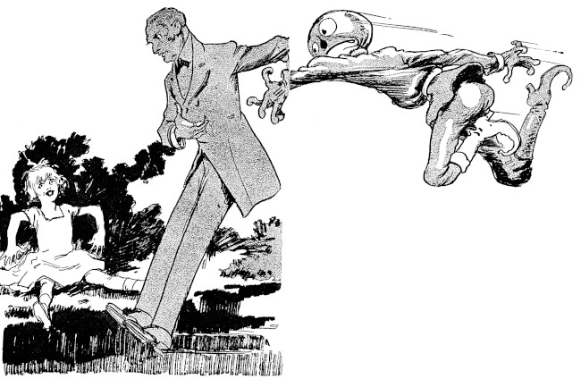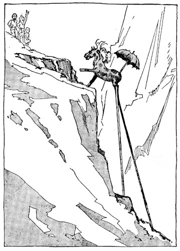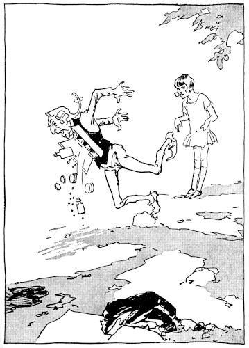 "What now?" groaned the statue dismally, clutching his umbrella. "Am I a bird? Why, Oh why did I ever leave my pedestal?" But wishing made no difference at all and down he dropped to the very bottom of no where. Then all at once he crashed through a crust of blue sky out into the blazing sunlight and thumped down in the middle of a broad green field. Luckily he landed upon his feet, but so hard and so heavily that he went down to his knees in soft earth. For a few moments he stood perfectly still. Then, closing his umbrella, he pulled one leg and then the other out of the mud and took a few steps to shake the stuff from his stone shins.