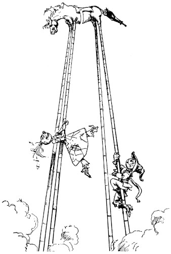 "Hi! Hi! Everybody Hi! I am the highest horse in Oz! High horse to Their Majesties, King and Queen of the North." Arm in arm Philador and Trot returned to the banquet hall and, after the last speech had been made and they had all drunk the health of the new sovereigns in pale pink lemonade, the party broke up and they all went out into the garden to play blind-man's buff.