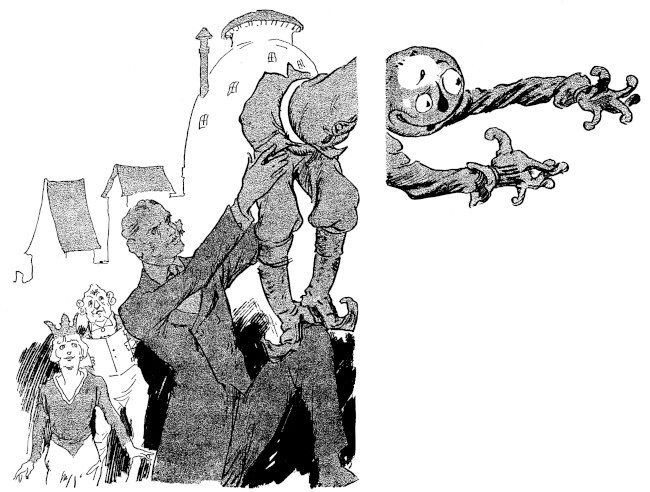Alarmed and disgusted, and protecting himself as well as he could with the old lady's umbrella, the Public Benefactor decided to return to his pedestal. But in the excitement he took a wrong turning. Then he began to run and the crowd to run after him—faster and faster and faster. His stone feet, thudding upon the asphalt, shook the houses on both sides and, dodging as best he could the sticks, stones and other missiles of his pursuers, the poor bewildered statue ran on. Being very large and perfectly tireless, he soon out-distanced them and, looking over his shoulder to make sure, failed to notice the steep embankment ahead, till it was too late. The workmen themselves had not intended to blow such a terrific hole in the earth; a thin crust of earth at the bottom hid the yawning cavity from view. But the stone man, tumbling head over heels down the steep sides, crashed through this crust as if it had been paper and plunged into a damp darkness.