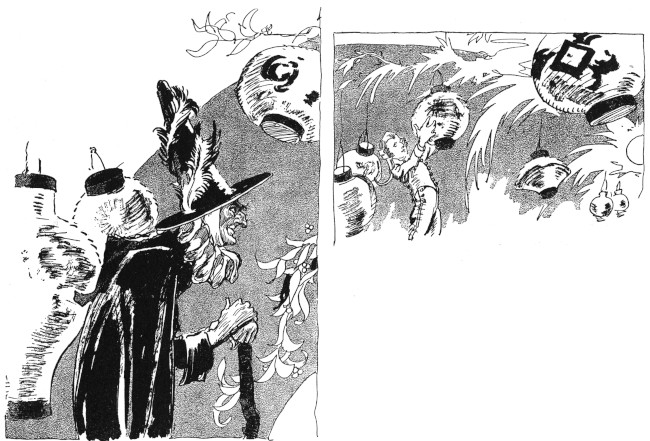 "At that time, as you all know, Mombi was ruler of the North. Passing Gilkenny one late afternoon and seeing the footmen hanging lanterns in the garden, she stopped to inquire the reason for the festivities. Cheeriobed, who was helping with the decorations, quickly explained that they were for our wedding, and Mombi, in spite of her extreme age and ugliness, fell instantly and deeply in love with the Prince. As I watched uneasily from a hidden arbor, I saw the old witch transform herself into a charming young maiden. Following Cheeriobed about, she explained that she was no longer an old and ugly witch, but a powerful Princess, that if he would marry her they would have not only the Gilliken Country, but the Munchkin Country as well for their Kingdom."