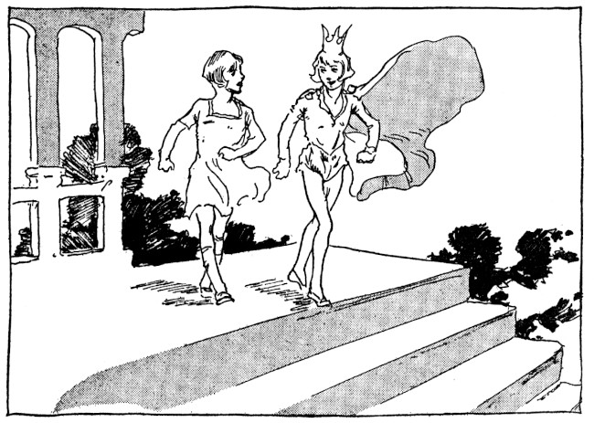 It was noon time when they dropped down lightly in the gardens of Ozma's castle. "Let's dance!" proposed Benny, blinking across the vistas of velvet lawns, flowering arches and sparkling fountains.