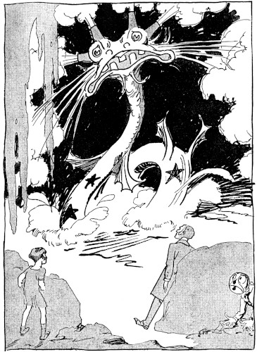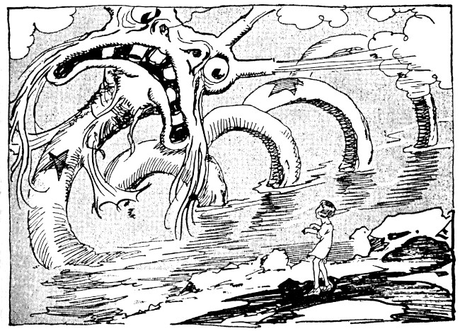 As if to answer the old Prime Moneyster the castle rocked more violently than ever. The waters of Orizon below began to toss and bubble, and presently from their churning depths rose the frightful head of Mombi's monster. No sea serpent was ever uglier than Quiberon, fire shot from his eye and smoke from his nostrils. He had the head scales and talons of a dragon and the long hideous body of a giant fear-fish. As Toddledy clutched at the curtains to keep from falling, Quiberon sent a great cloud of smoke upward. It twisted, curled and spiraled, forming itself finally into a long black sentence, the words hanging like a dark threat in the clear morning air.