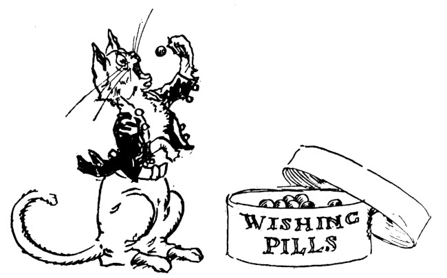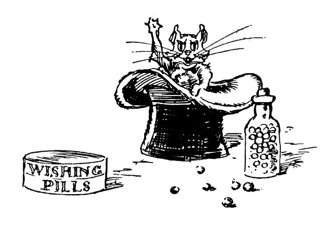 "Never mind," comforted Herby, opening his medicine chest. "I have a cure for that too." Taking out two pills and slipping them down High Boy's throat, he winked knowingly. "They will dull the pangs of hunger," he assured him gravely. While High Boy, with closed eyes waited for his pangs to be dulled, Ozma looked happily around the friendly group of Ozure Islanders.