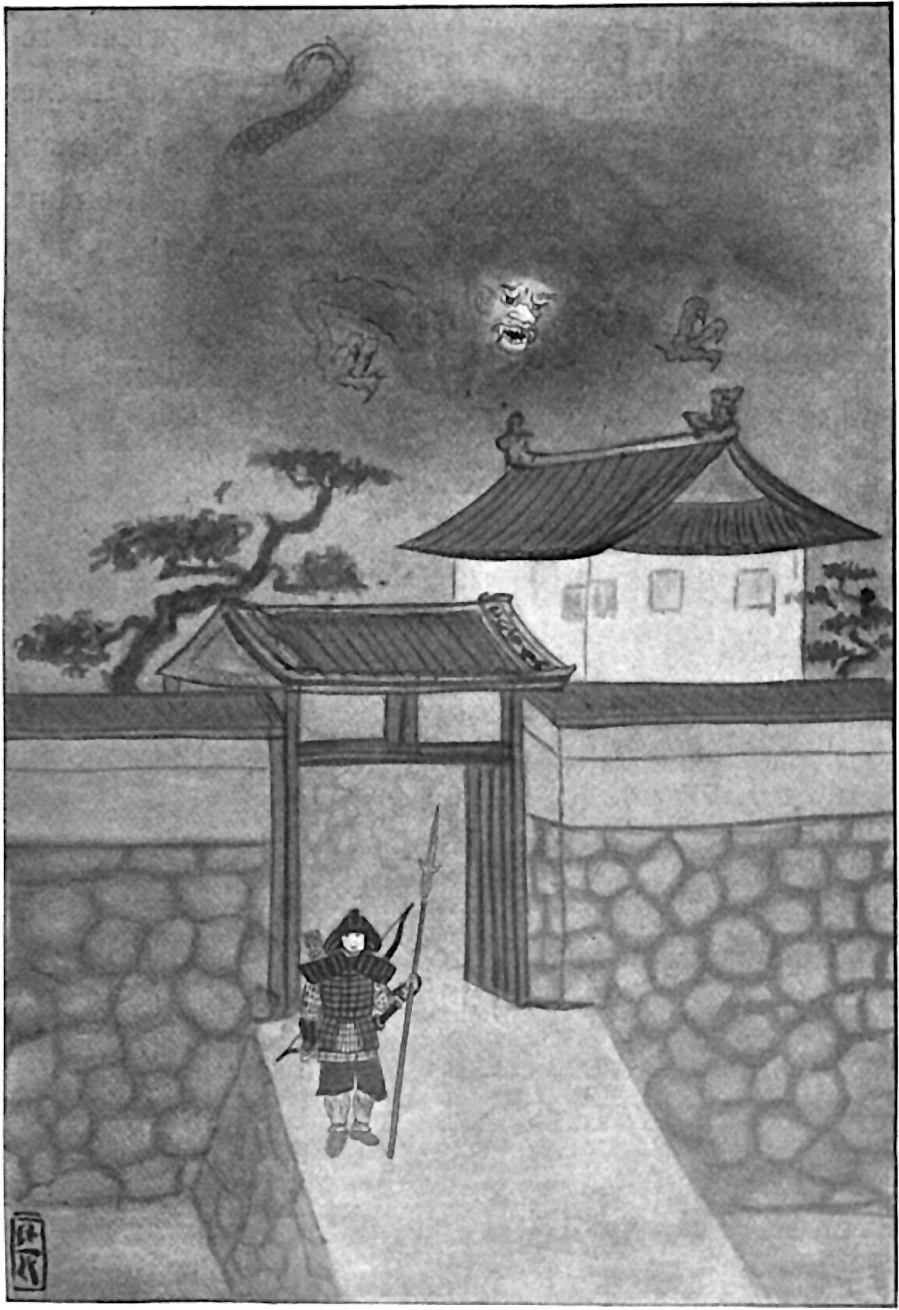 Ruined though the temple was, it still held a shrine and hither came Wakiki Mononofu, a young Samurai.[3] He was a brave young soldier who was seeking his fortune in the wide, wide world. He had lost his way and wandered in the forest seeking the path, until at length he came to the little clear space where was the temple. A storm was coming up, and a palace could not have seemed more welcome to the young warrior.