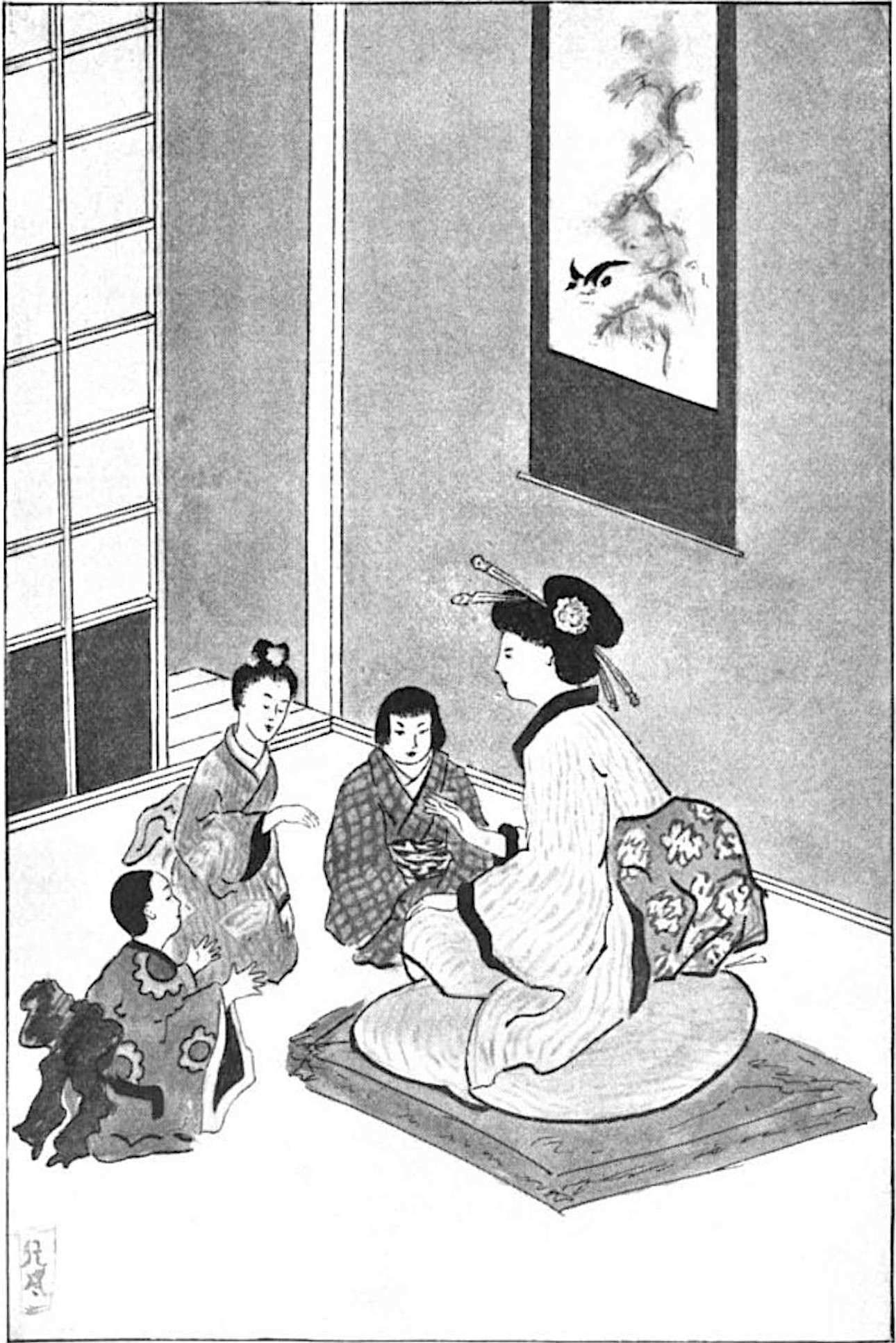 Thanking her the young warrior went in and seated himself upon the floor. The parents of the young girl greeted him courteously. A small table was set before him, and on it was placed rice and tea. He ate heartily, and, when he had finished eating, rose to go.
