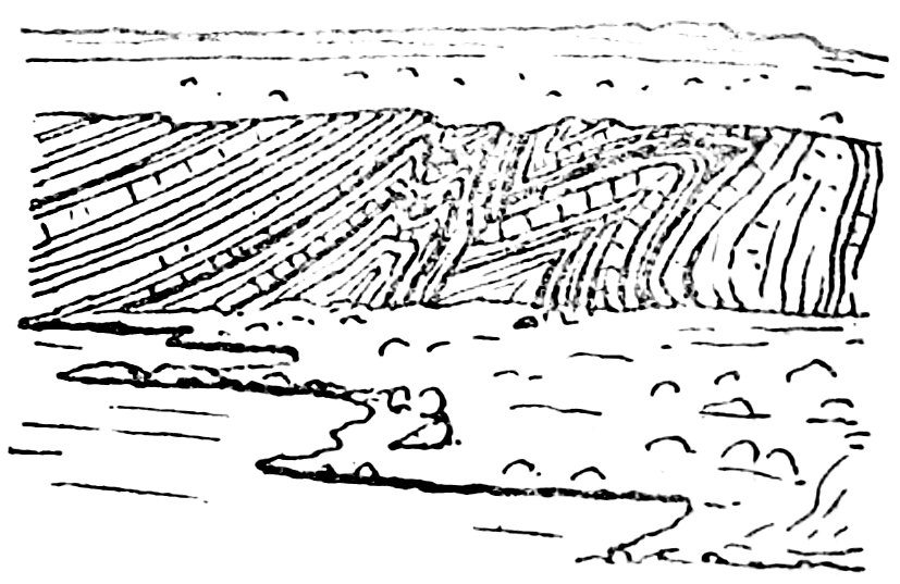 A section taken from Baharia or Kharga Oasis to the shores of the Red Sea reveals the fact that Egypt proper is bounded on the west by a low flat arch which has brought the underlying sandstones nearer to the surface, giving rise to the great oases.[4] These are mainly present in the sandstone areas, and are in part bounded by cliff-walls composed in many instances of clays at the base and limestones at the summit. To the east, on the other hand, rise the Red Sea hills, the central core of a steeply inclined arch in which the resistant granites and schists now rise high above the low-lying sandstone country which flanks them. Between these two arches is the flat-bedded syncline in which the nummulitic limestone is the conspicuous member, the[7] strata in central Egypt having in consequence a half cup-shaped form, of which one half, the northern, may have disappeared by fracture beneath the waters of the Mediterranean Sea. This cup-like structure may be due to Egypt having not only been folded in a north-west and south-east direction but also almost at right angles, this latter folding giving rise to such remarkable features as the Wadi Araba, the Qena bend, and possibly affording the fundamental explanation for the great S-shaped bends of the Nile. In other and more mountainous regions, such as the Alps and Himalayas, these solid earth-waves may be under such immense pressure that their crests begin first to turn over like those of an advancing wave of the sea, and then may be broken in such a way that mighty masses of strata are rent asunder, those portions which are uppermost being thrust for great distances over the underlying beds. These extreme folds ending in fracture, or overthrusts, are as yet but little known in Egypt, though Dr. Ball has reported an interesting case from the neighbourhood of Abu Harba, and some of the phenomena of dislocation observed near the borders of the Gulf of Suez may possibly be explained as resulting from movements of this nature.
