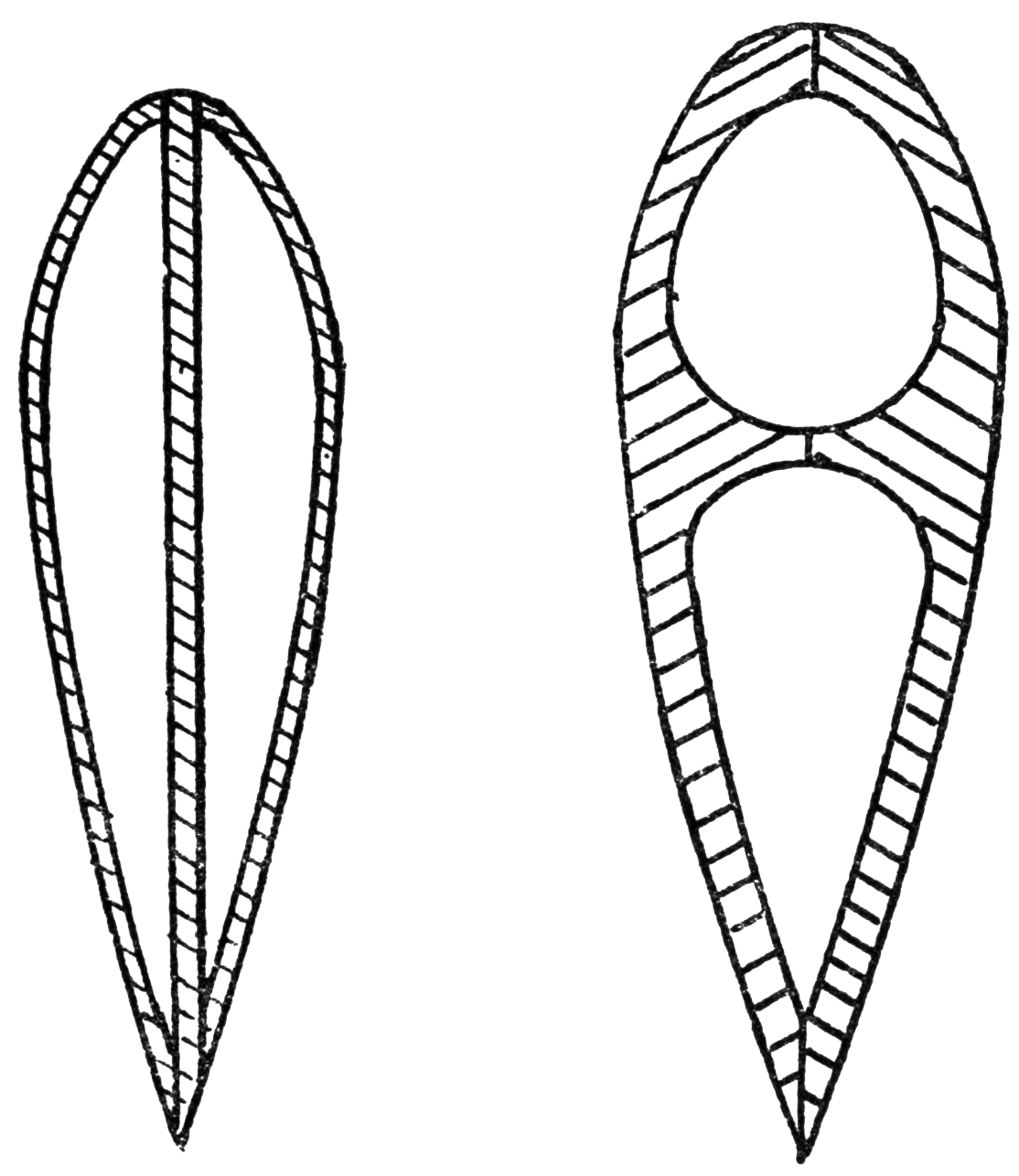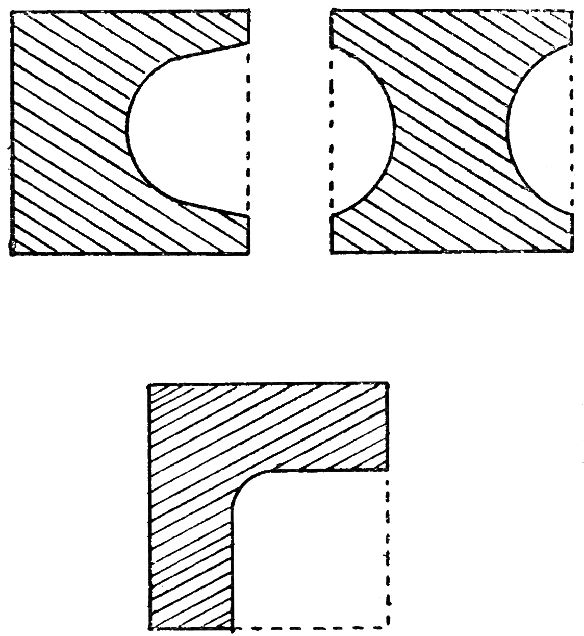 Perhaps the most common and prolific defect encountered with the use of timber is the presence of cracks or shakes of different character, which are due to different causes. Fig. 1 indicates a very common form, known as a “heart shake,” dividing the timber at the centre; while Fig. 2, a “star shake,” is really a number of heart shakes diverging from the centre. The process of seasoning sometimes results in the separation of the annual rings, forming cup shakes, as shown in Fig. 3. It should be understood that the presence of shakes may render useless an otherwise perfect specimen of timber, as it frequently happens that in the conversion of timber so affected the usable portions do not permit of the sizes necessary for such items as wing spars and struts. The