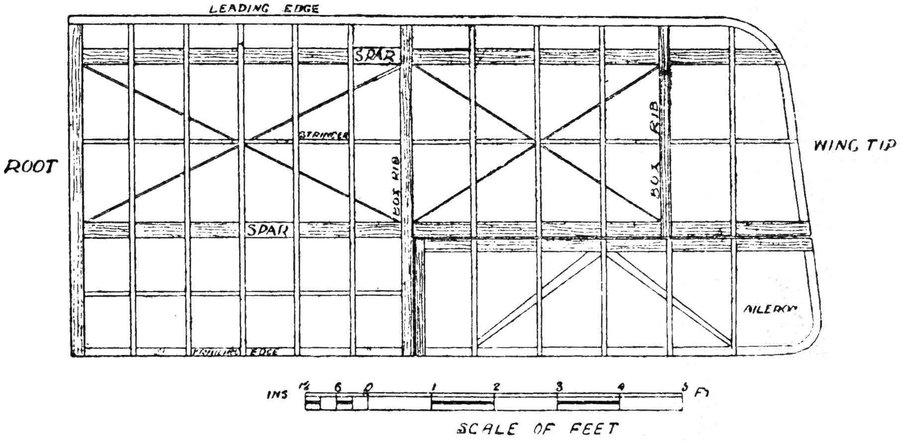 The planes or sections of a machine of the straight-wing type, as distinct from a machine possessing arrow-shaped or retreating wings, should, when erected on the fuselage, form a straight line from tip to tip. This feature is dependent upon (1) the trueness of the planes, and (2) the alignment of the attachments on the fuselage, the latter being considered under the fuselage heading. To ensure that the plane is quite square, it should be checked previous to covering by diagonal measurements on the wing spars, these being taken from accurate set positions such as are provided by the wing-root attachments and the interplane strut fittings. Should a difference in the diagonals exist, this can easily be rectified by a127 slight adjustment of the turnbuckles incorporated in the internal plane wiring. As the ribs of the plane are built up beforehand, and checked for correct contour by pattern, little variation should occur in the camber. A point where differences may occur is between the front spar and the leading edge, as the nose formers are generally inserted during the assembling of the plane. For the detection of faults in this direction the template illustrated by Fig. 34 in Chapter IV. is of great utility.