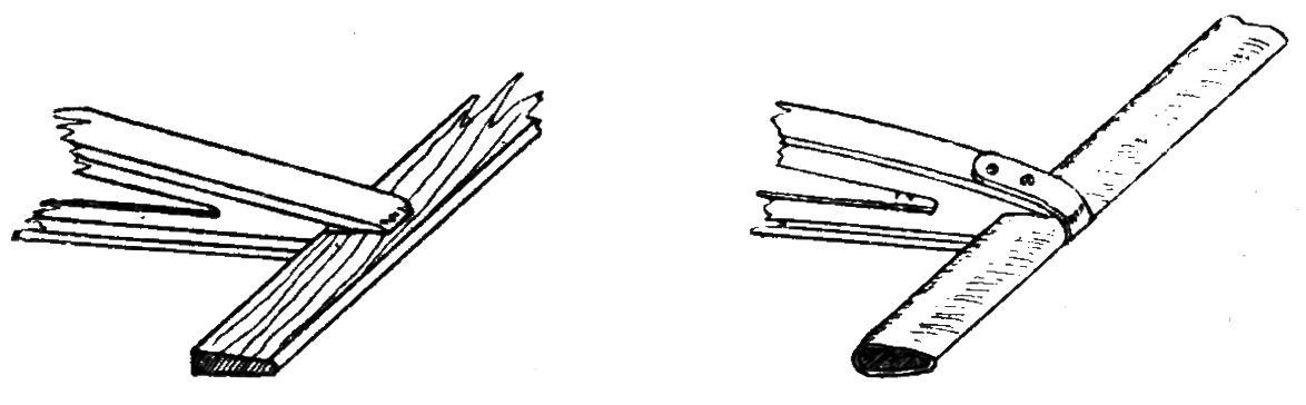 It is notable that, so far, the wiring of all German aeroplanes is effected by cable, so that apparently the merits of the streamline wire are not recognized. It is also surprising that no attempt has been made to streamline the cable. A device for tying the wires and preventing friction at the point of intersection, found on nearly all enemy aeroplanes, is indicated by Fig. 116, and there are also instances of quick release devices, these being popular in this country about 1912, and now obsolete.