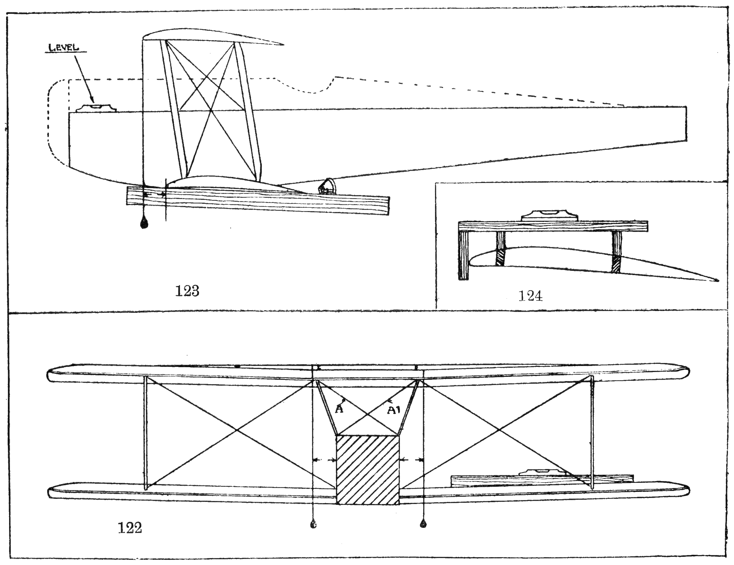 In this connection it will be better to consider the alignment of a type of machine in common use: a tractor-biplane in which the upper plane is composed of two outer planes and a centre section, and the lower plane in two sections, each abutting against the side of the fuselage, this arrangement being shown in front elevation by Fig. 122. The first operation is the levelling of the fuselage transversely by placing the level across the engine bearers, and the attachment of the centre section, which is mounted upon four struts which have been previously cut to dead length and tested by jig. This, considered in front elevation, should be centrally placed over the body, and this is assured by adjustments in the wires A-A1. This can be checked by dropping a plumb-line from the centre plane spar ends and measuring the distance from the line to the side of the body, the distances on either side should, of course, coincide. The next point is to brace the outer sections to the correct dihedral. One method of accomplishing this, as shown by Fig. 122, is by the use of a dihedral board, this being prepared perfectly straight on one edge, the other being tapered to the desired angle. The wires are then adjusted until the straightedge is level. Another method is to use an ordinary straightedge placed along the top surface of the plane, the angle being measured with a protractor or clinometer, the latter instrument being most accurate. To check the dihedral a line can be stretched between points immediately above the top interplane struts on each side and then measuring to the centre section, but it would be difficult131 to detect differences in the angles of each wing. With regard to the undercarriage, the distances between lines dropped from the fuselage sides and the wheel centres should coincide.