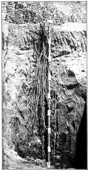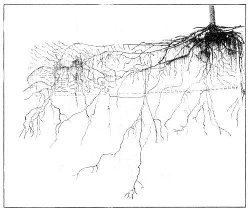 Soil and Subsoil in their Relations to Vegetation, 161.—Physical Effects of the [Pg ix] Percolation of Surface Waters, 161.—Chemical Effects; Calcareous Subsoils and Hardpans, 161.—“Rawness” of Subsoils in Humid Climates, 162.—Subsoils in the Arid Region, 163.—Deep Plowing and Subsoiling in the Arid Region; examples of Plant growth on Subsoils, 164.—Resistance to Drought, 167.—Root System in the Humid Region, 168.—Figures of the Root System of an Eastern (Wisconsin) Fruit Tree, 168.—Comparison of Root Development in the Arid and Humid Regions, 169.—Prune on Peach Root, 169.—Adaptation of Humid Species to Arid Conditions, 169.—Grapes, 170.—Kentucky and California Maize, 175, 176.—Hops, 172.—Deep-Rooting in the Arid Region, 174.—Goose Foot and Figwort, 174.—Importance of Proper Substrata in the Arid Region, 173.—Injury from Impervious Substrata. Figure, 177.—Faulty Lands of California. Figure, 178.—Shattering of Dense Substrata by Dynamite, 181.—Leachy Substrata, 182.—“Going-back” of Orchards, 182.—Hardpan, Formation and Varieties, 183.—Nature of the Hardpan Cements, 184.—Bog Ore, Moorbedpan and Ortstein; Calcareous and Alkali Hardpan, 184.—The Causes of Hardpan, 185.—“Plowsole,” 186.—Marly Substrata, 186.