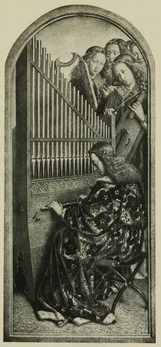 | From the Adoration of the Lamb by Jan and Hubert van Eyck, in the Cathedral of St. Bavon, Ghent. St. Cecilia is playing the organ, one of the Angels a harp (of the “Irish” type) and another a violin without “bouts” and with crescent-shaped sound-holes. Note the peculiar and archaic shape of the bow. This picture was painted in the Fifteenth Century. | |
