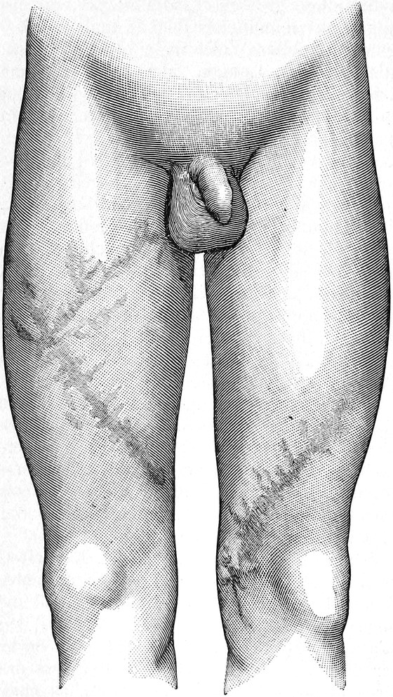 [548] Derartige Schwielen finden sich bei einzelnen Berufsclassen auch an anderen Stellen. Hierher gehören die Schwielen an den Oberschenkeln der Schuster und die mit Verdickungen des Periost verbundenen Schwielen über den Dornfortsätzen der ersten Brust- und der Lendenwirbel, die von Lombroso und Cougnet („Studi sui segni professionali dei Facchini.“ Torino 1879) an Lastträgern beobachtet und zum Gegenstande besonderer Studien gemacht wurden.