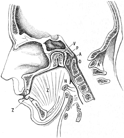 [538] Beim Weibe bleiben Kehlkopf- und Rippenknorpel häufig bis in’s hohe Alter unverknöchert, respective unverkalkt, nur ausnahmsweise beim Manne; so haben wir einen 73jährigen schwächlich gebauten Mann secirt, bei welchem nur Verknöcherung der hinteren Bänder der Schildknorpel und der basalen Theile der Schildknorpelhörner, sowie der Ringknorpelplatte bestand und in den Rippenknorpeln nur Spuren davon sich fanden. Ausführliche Untersuchungen über das Verhalten des Kehlkopfes in den verschiedenen Lebensaltern und bei beiden Geschlechtern hat Patenko (Vierteljahrschr. f. gerichtl. Med. XLI) angestellt. Es geht aus denselben hervor, dass die Verknöcherung keiner Gesetzmässigkeit unterliegt, sich aber im Allgemeinen beim Weibe langsamer und im geringeren Grade entwickelt als beim Manne. Gleiches ergab sich bezüglich der Rippenknorpel und bezüglich der Ankylose der grossen Zungenbeinhörner mit dem Körper.