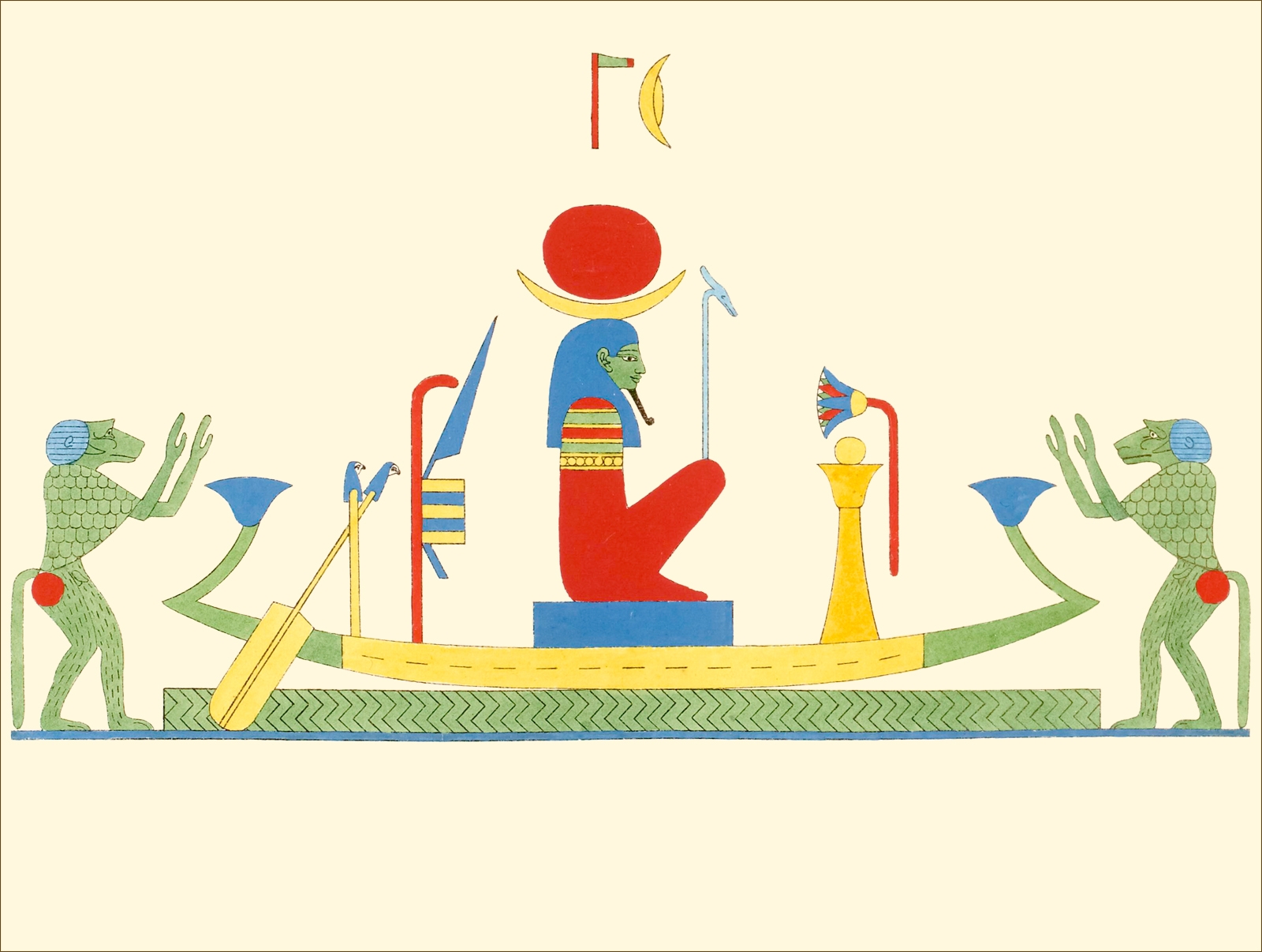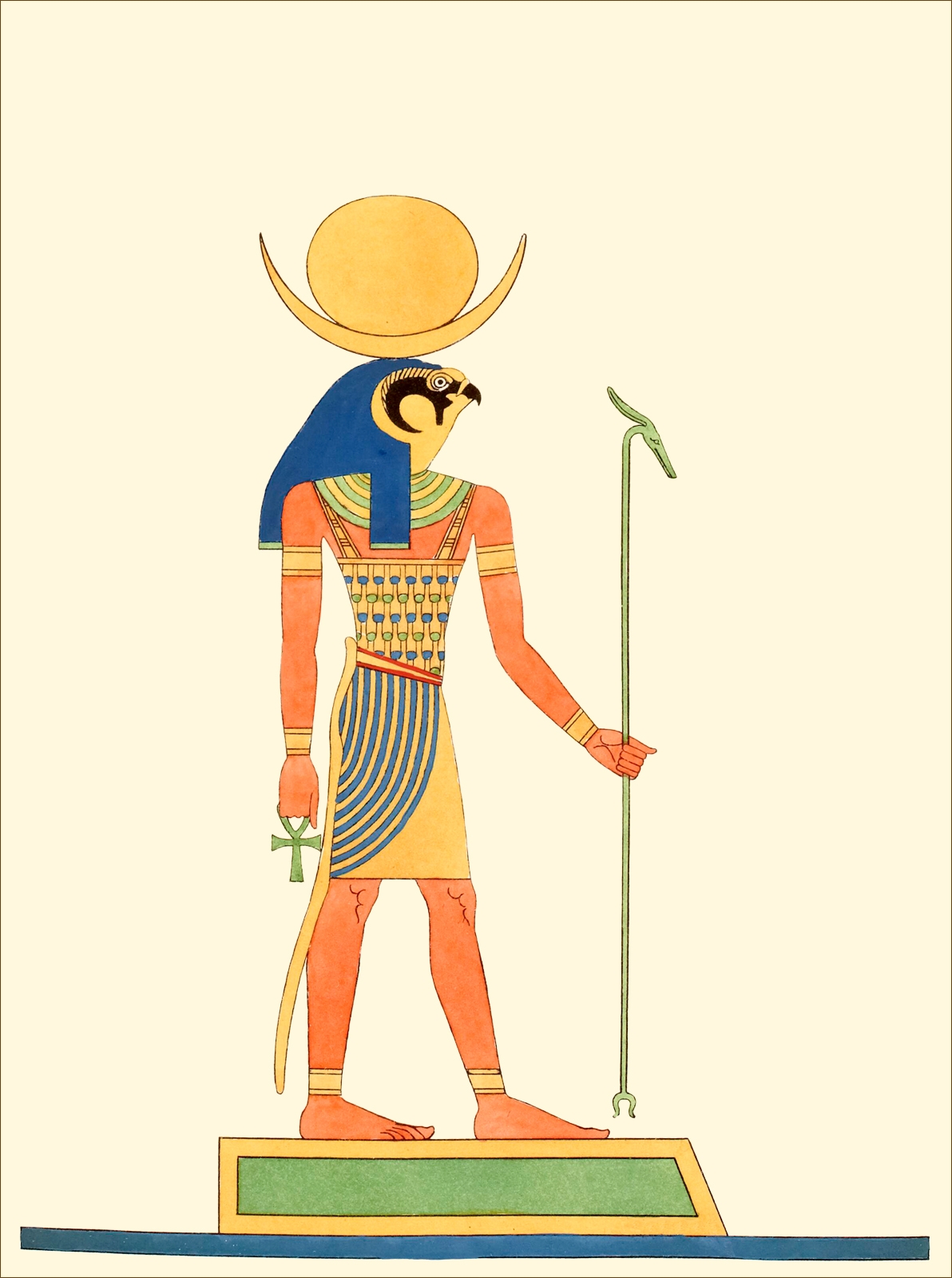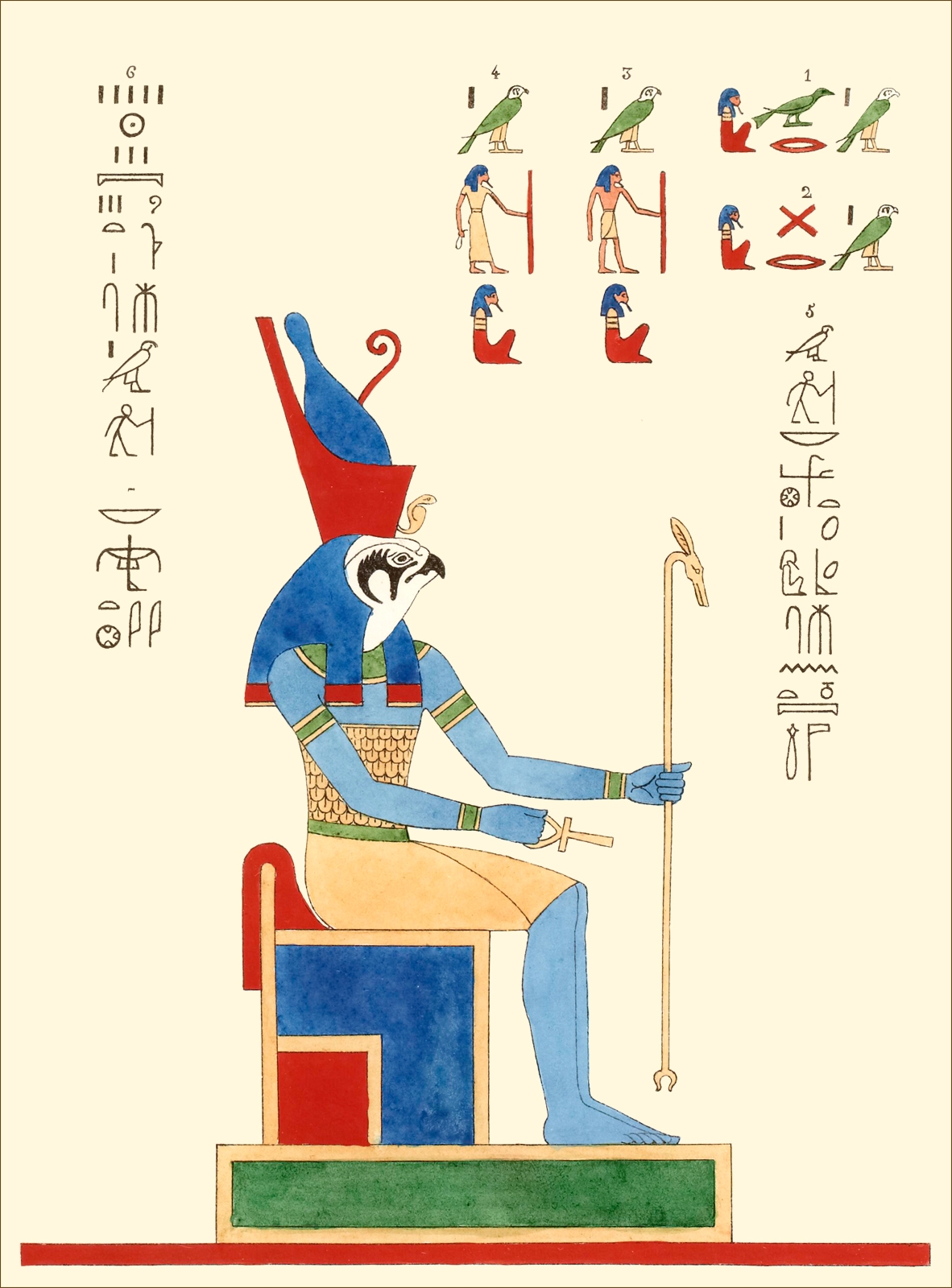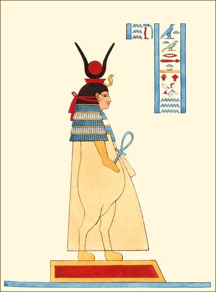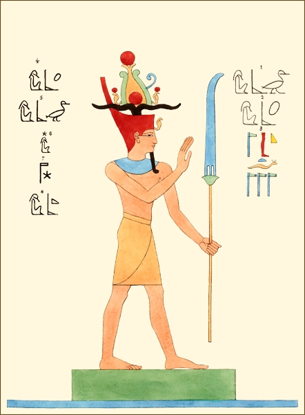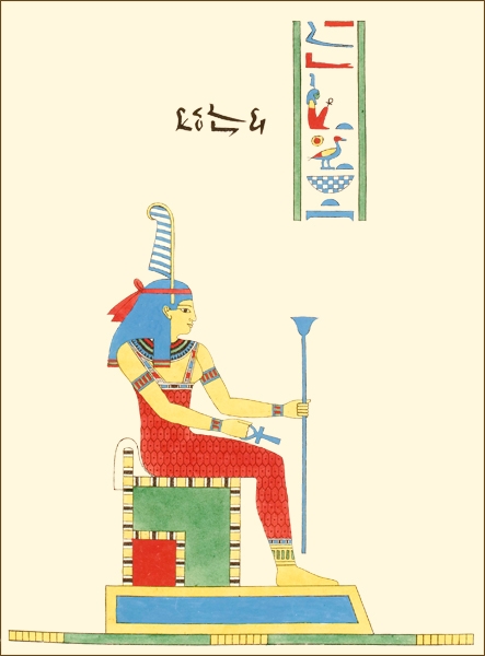 Le dieu est assis sur son trône; sa tête est celle d’un bélier, et toutes ses chairs sont bleues et souvent vertes, comme celles d’Amon, dont il n’est lui-même qu’une simple modification; un grand disque, porté sur des cornes de bouc, symboles de la force génératrice, surmonte sa tête, au-dessus de laquelle se dresse aussi un grand serpent Ureus, emblême de la suprême puissance de vie et de mort que cette divinité exerce sur tous les êtres; sa main droite tient le signe ordinaire de la vie divine, et la gauche, plus souvent armée du sceptre des dieux bienfaisants, est ici élevée en signe de protection.