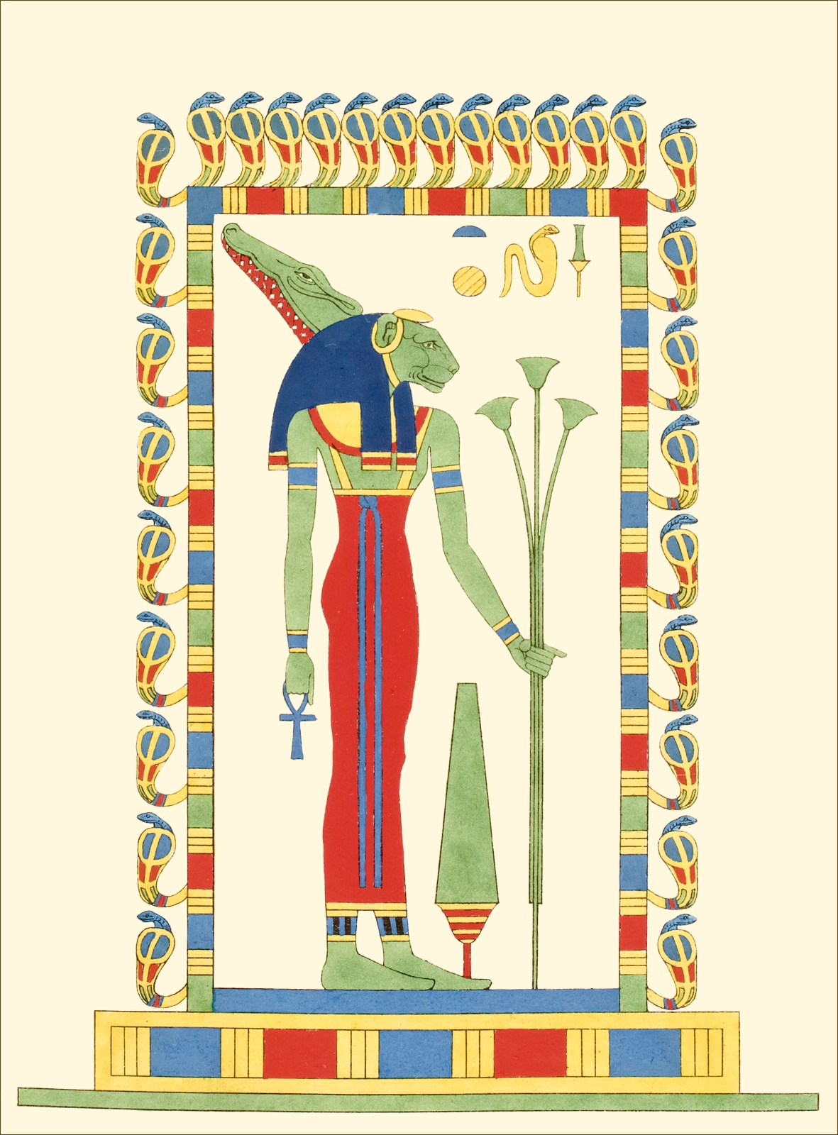 Cette grande divinité, une des modifications d’Amon, fut considérée par les Égyptiens, comme la source de tous les biens moraux et physiques; on l’appelait spécialement le bon Génie (Αγαθοδαιμων), le bon Esprit; c’était le principe de toutes choses, l’esprit qui animait et perpétuait le monde en le pénétrant dans toutes ses parties[29].