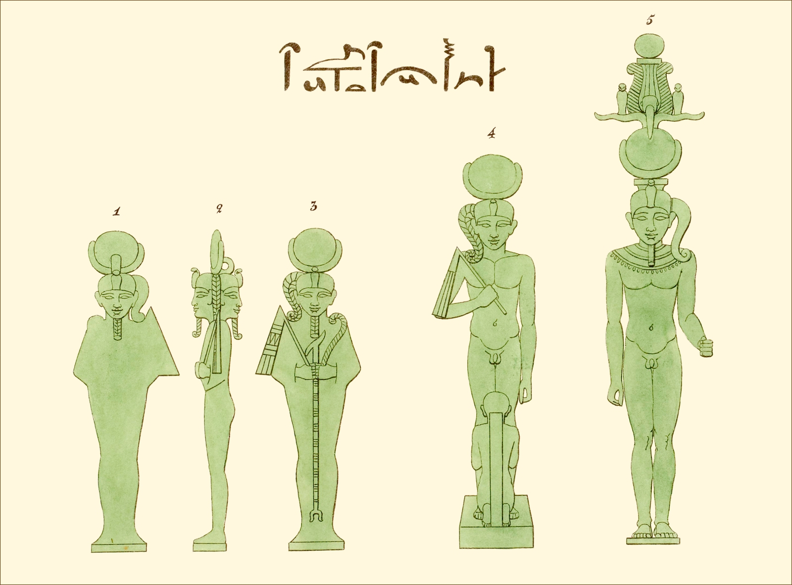 Le grand Démiurge égyptien Cnouphis, considéré comme le Nil céleste et comme la source et le régulateur du Nil terrestre, est très-souvent figuré dans les bas-reliefs des temples, sur les cercueils et les diverses enveloppes des momies. Ses images ne diffèrent point très-essentiellement de celle que nous donnons ici sous le no 3.3. Partout il se montre avec sa tête de Bélier et ses chairs de couleur verte, quelquefois aussi de couleur bleue. On le distingue uniquement à sa légende et à quelques attributs particuliers.