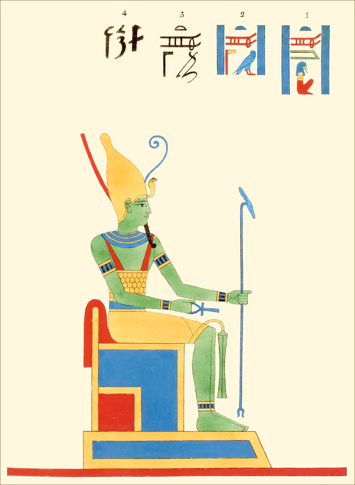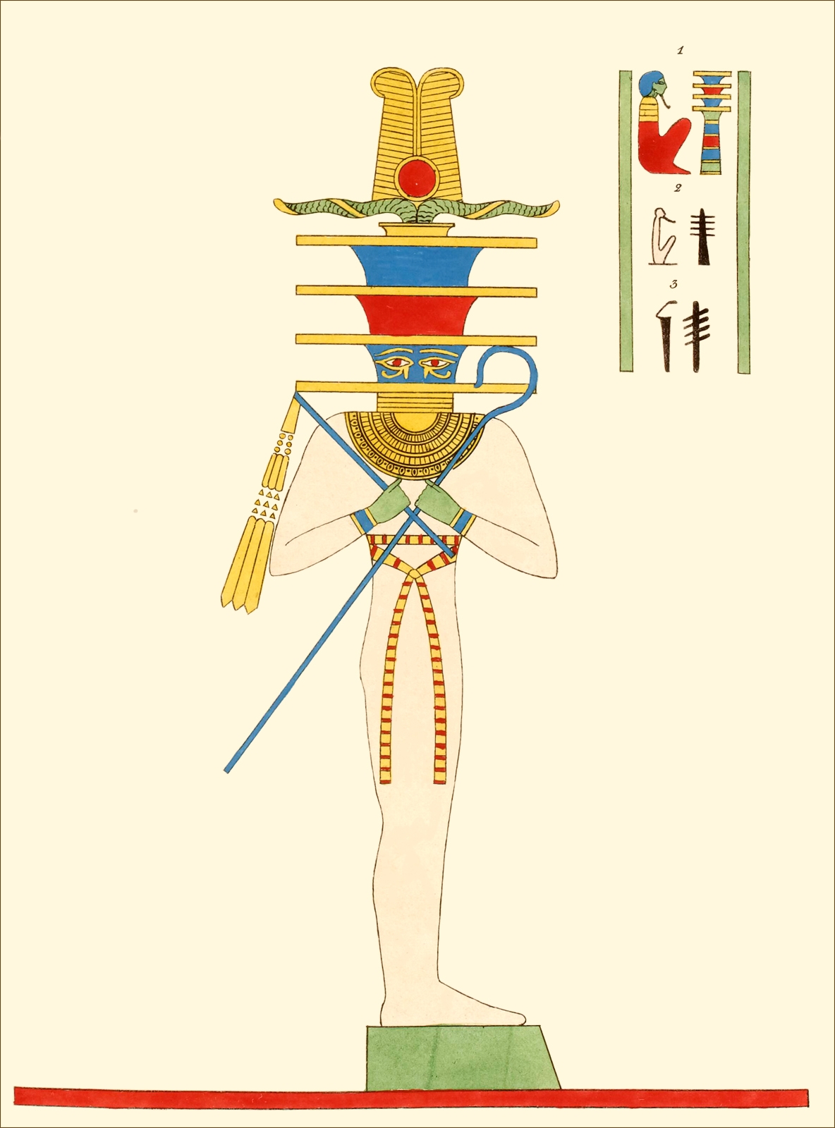 Ce dieu, de forme humaine, est ici représenté assis sur un trône, comme le sont pour l’ordinaire toutes les grandes divinités de l’Égypte. Sa carnation est bleue, couleur propre à ce personnage; sa barbe est figurée par une appendice noire qui caractérise les divinités mâles; et dans les cercueils de momie, cette même appendice indique toujours une momie d’homme; le dieu tient dans sa main gauche un sceptre terminé par la tête de cet oiseau qu’Horapollon nomme Koucoupha, sceptre commun à toutes les divinités mâles du Panthéon Égyptien, et qui était le symbole de la bienfaisance des dieux; dans sa main droite est la croix ansée, symbole de la vie divine; sa tête est ornée d’une coiffure royale, surmontée de deux grandes plumes peintes de diverses couleurs; de la partie postérieure de sa coiffure, descend une longue bandelette bleue; son col est orné d’un collier, parfois très-richement décoré; sa tunique, d’abord soutenue au-dessous du sein, au moyen de deux bretelles, est fixée vers les hanches par une ceinture bleue; des bracelets ornent le haut de ses bras, et souvent aussi la naissance du poignet.